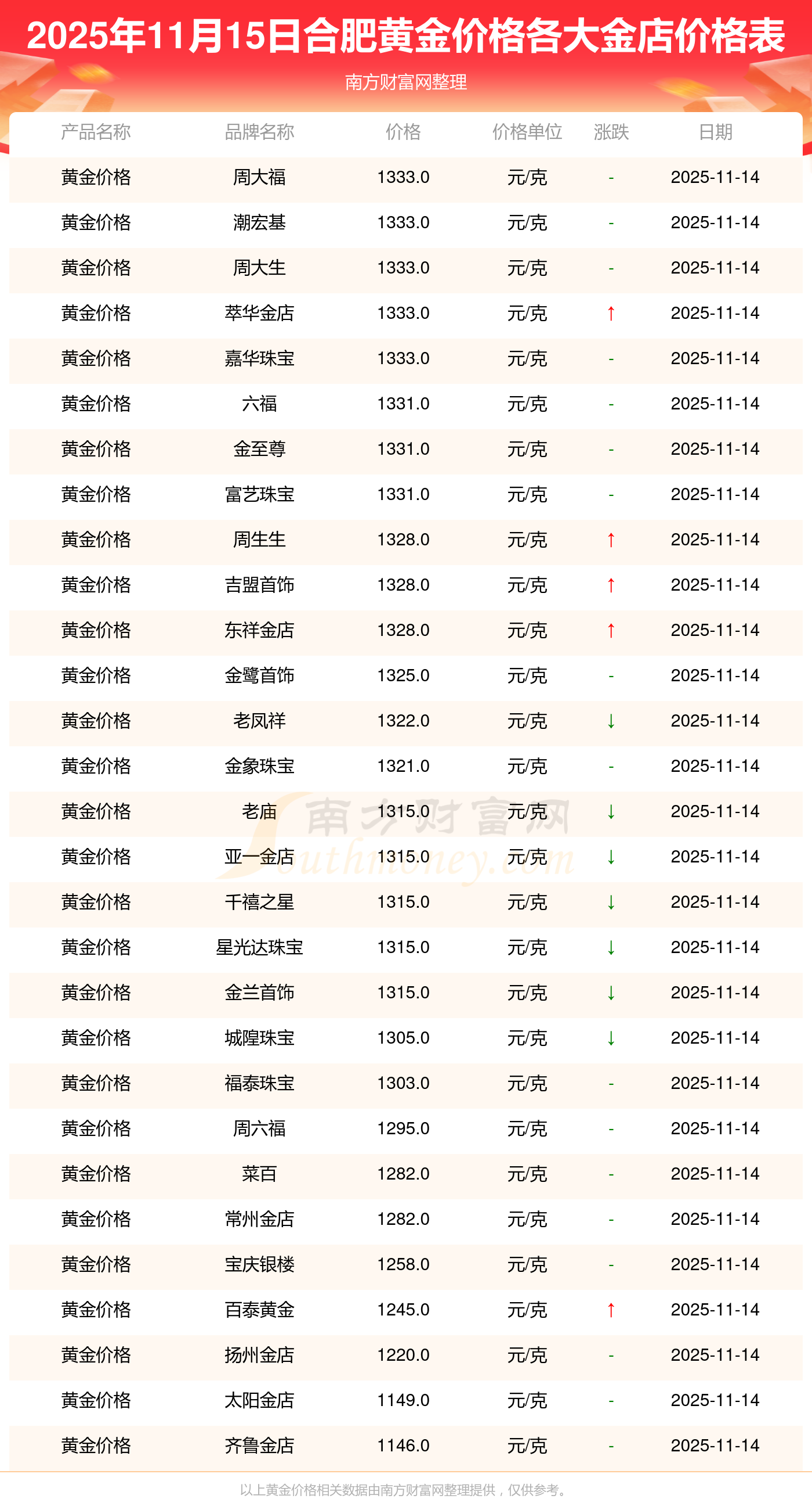 2025年11月15日合肥各大金店黄金价格最新价格:周大福1333.0元/克,周大福646.0元/克,周大福1333.0元/克,周大福46320.0,周大福18410.0,周大福41780.0,周大福1167.0元/克,老凤祥1322.0元/克,老凤祥600.0元/克,老凤祥1322.0元/克,周六福1295.0元/克。