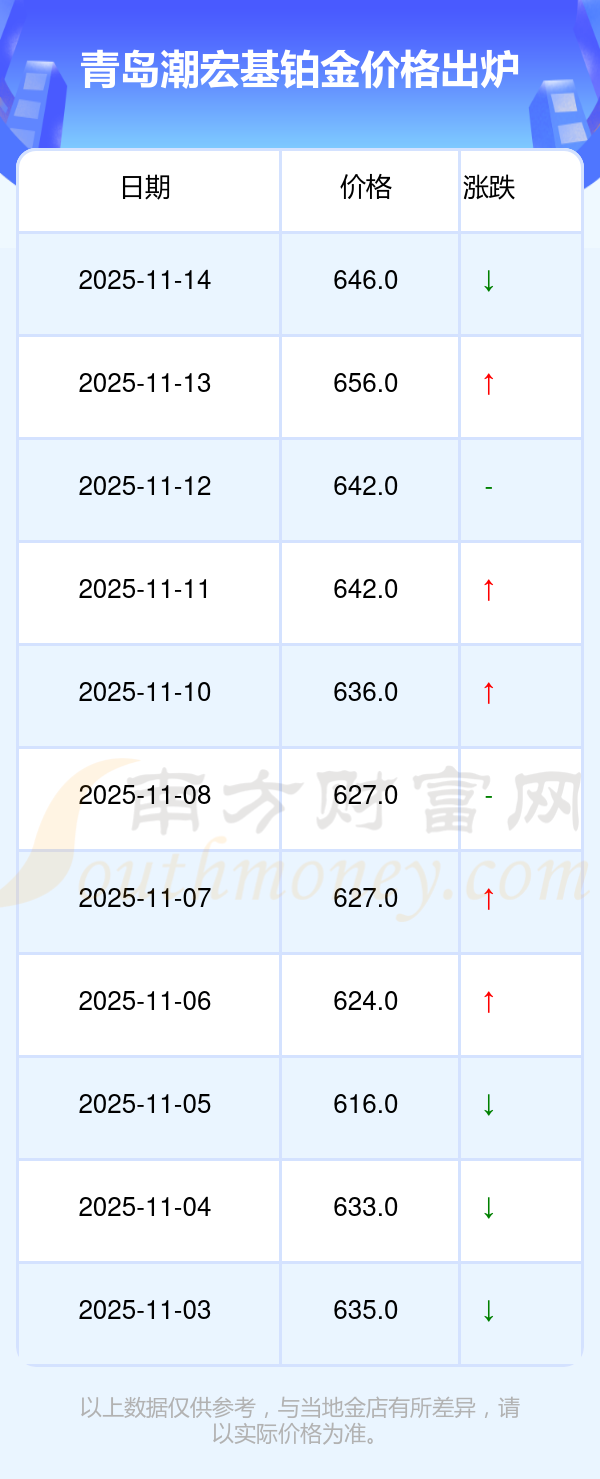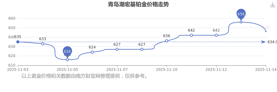 今日(2025年11月15日),646.0元/克是青岛潮宏基铂金价格的价格标准。