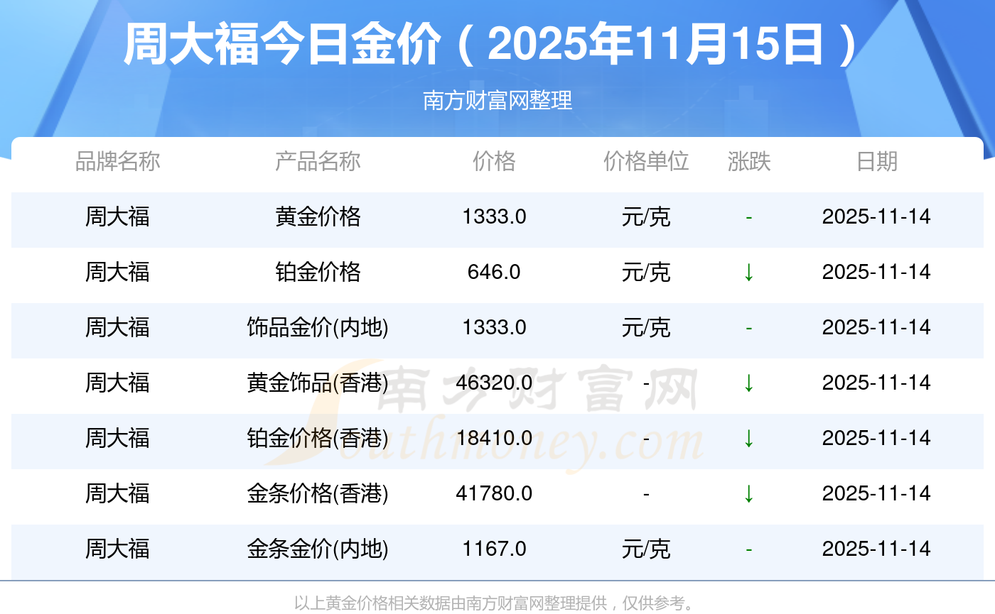 2025年11月15日周大福金价查询:黄金价格1333.0元/克,铂金价格646.0元/克,饰品金价(内地)1333.0元/克,黄金饰品(香港)46320.0,铂金价格(香港)18410.0,金条价格(香港)41780.0,金条金价(内地)1167.0元/克,黄金价格1322.0元/克,铂金价格600.0元/克,足金价格1322.0元/克,黄金价格1295.0元/克。