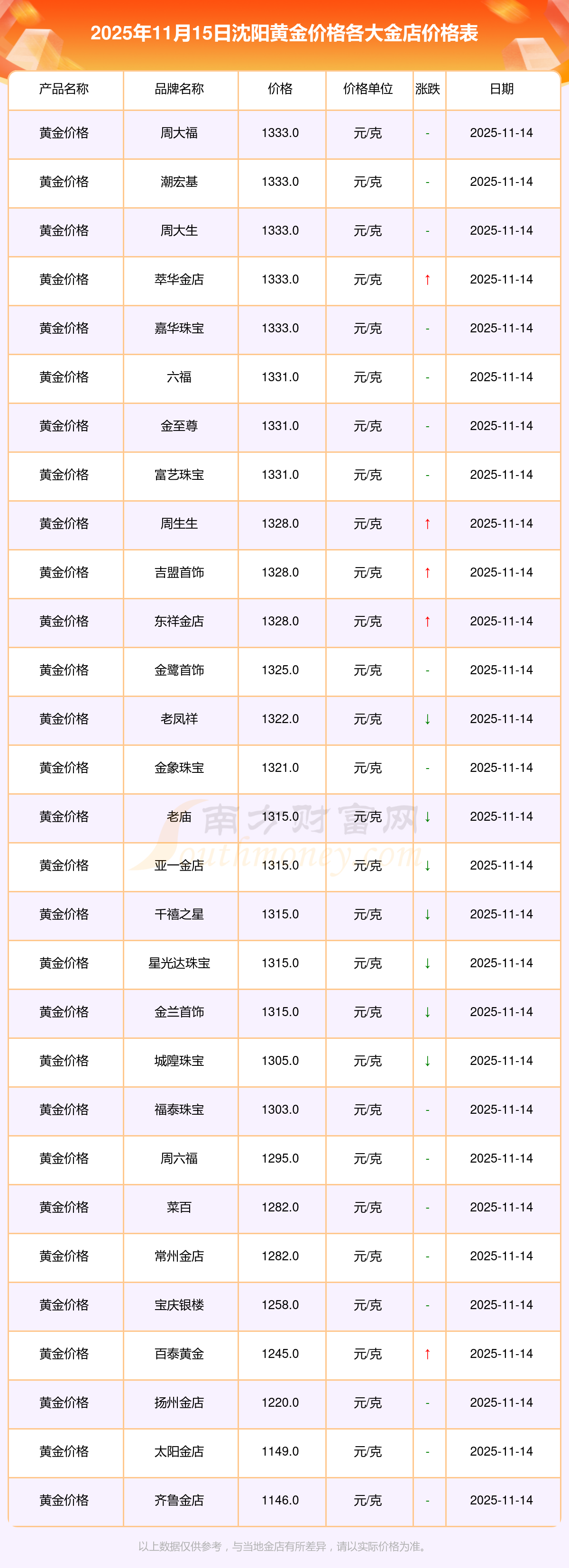 2025年11月15日沈阳各大金店黄金价格最新价格:周大福1333.0元/克,周大福646.0元/克,周大福1333.0元/克,周大福46320.0,周大福18410.0,周大福41780.0,周大福1167.0元/克,老凤祥1322.0元/克,老凤祥600.0元/克,老凤祥1322.0元/克,周六福1295.0元/克。