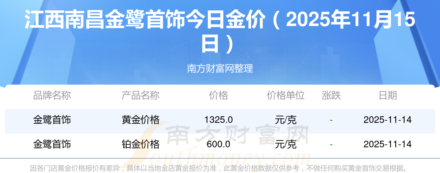 今日黄金价格具体是多少?现在一克黄金卖多少钱?江西南昌金鹭首饰,现在一克黄金定价多少?黄金价格1333.0元/克,铂金价格646.0元/克,饰品金价(内地)1333.0元/克,黄金饰品(香港)46320.0,铂金价格(香港)18410.0,金条价格(香港)41780.0,金条金价(内地)1167.0元/克,黄金价格1322.0元/克,铂金价格600.0元/克,足金价格1322.0元/克,黄金价格1295.0元/克。