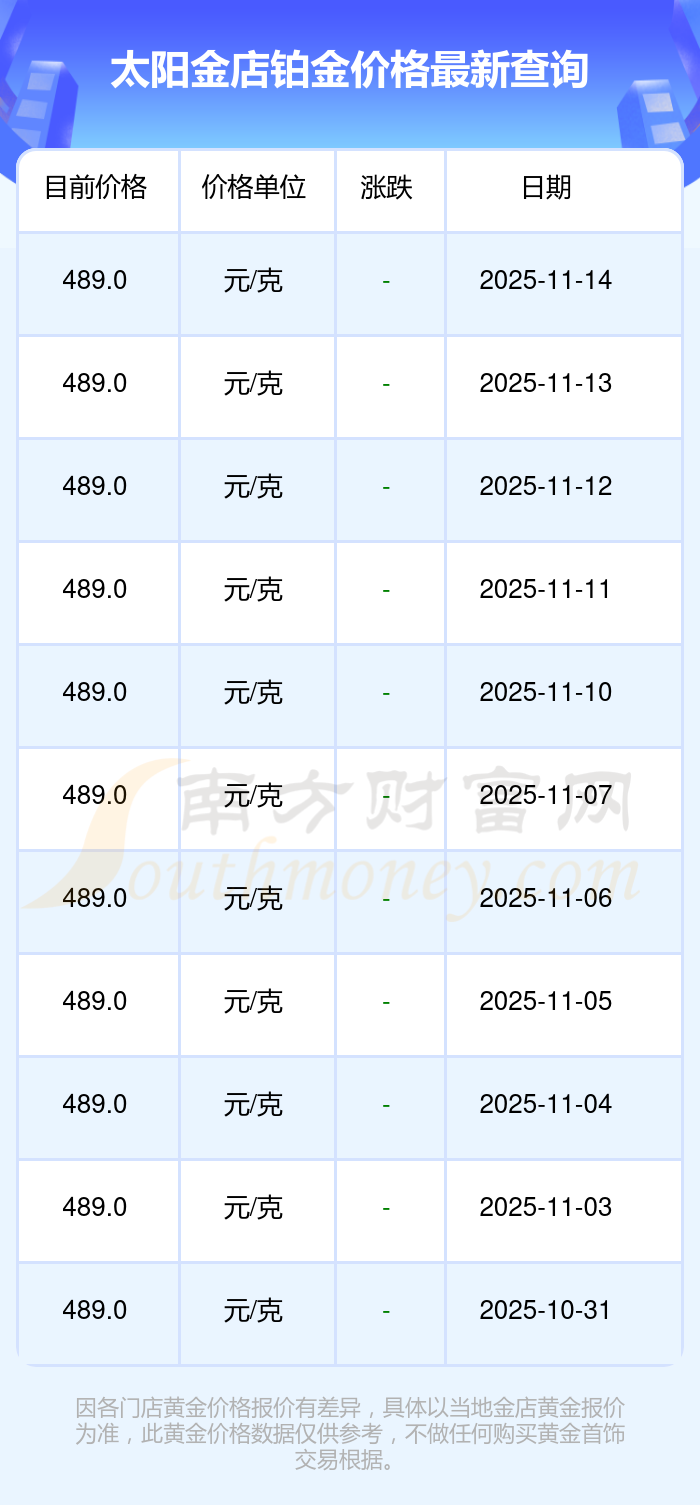 489.0元/克是太阳金店在今日给出的 铂金价格最新价格。