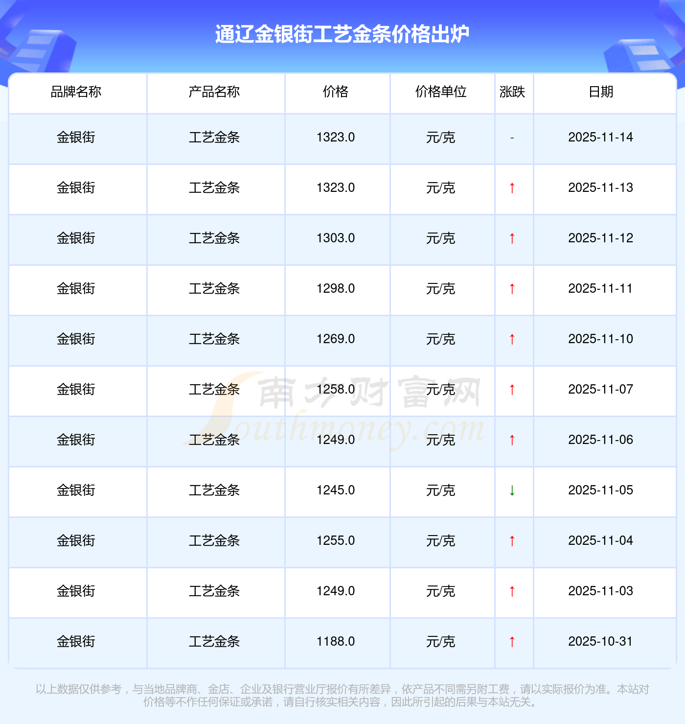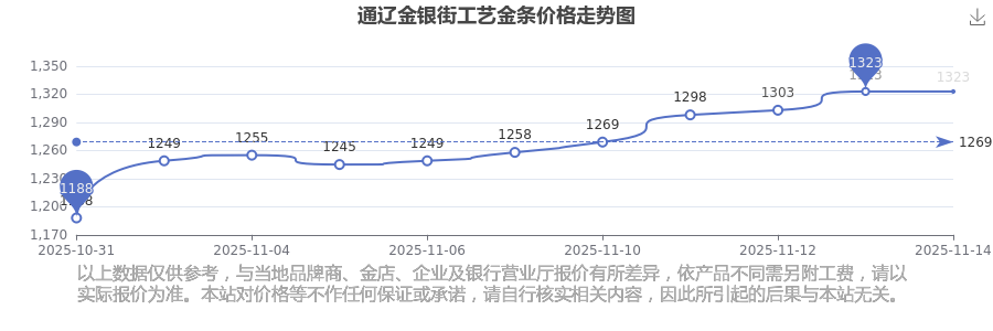 2025年11月15日通辽金银街工艺金条价格是1323.0元/克。