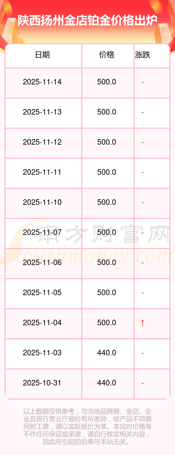500.0元/克,此乃陕西扬州金店于 2025年11月15日铂金价格的挂牌价格。