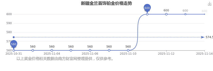 今日(2025年11月15日)新疆金兰首饰铂金价格为600.0元/克。