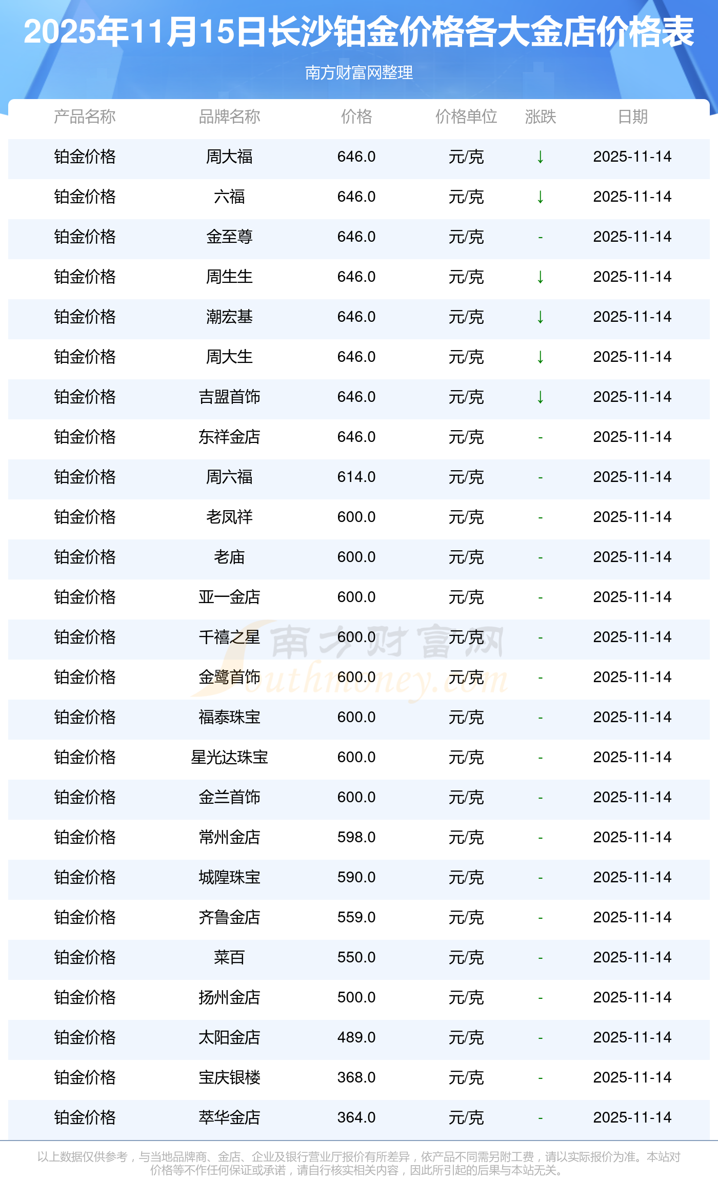 2025年11月15日长沙各大金店铂金价格最新价格:周大福1333.0元/克,周大福646.0元/克,周大福1333.0元/克,周大福46320.0,周大福18410.0,周大福41780.0,周大福1167.0元/克,老凤祥1322.0元/克,老凤祥600.0元/克,老凤祥1322.0元/克,周六福1295.0元/克。