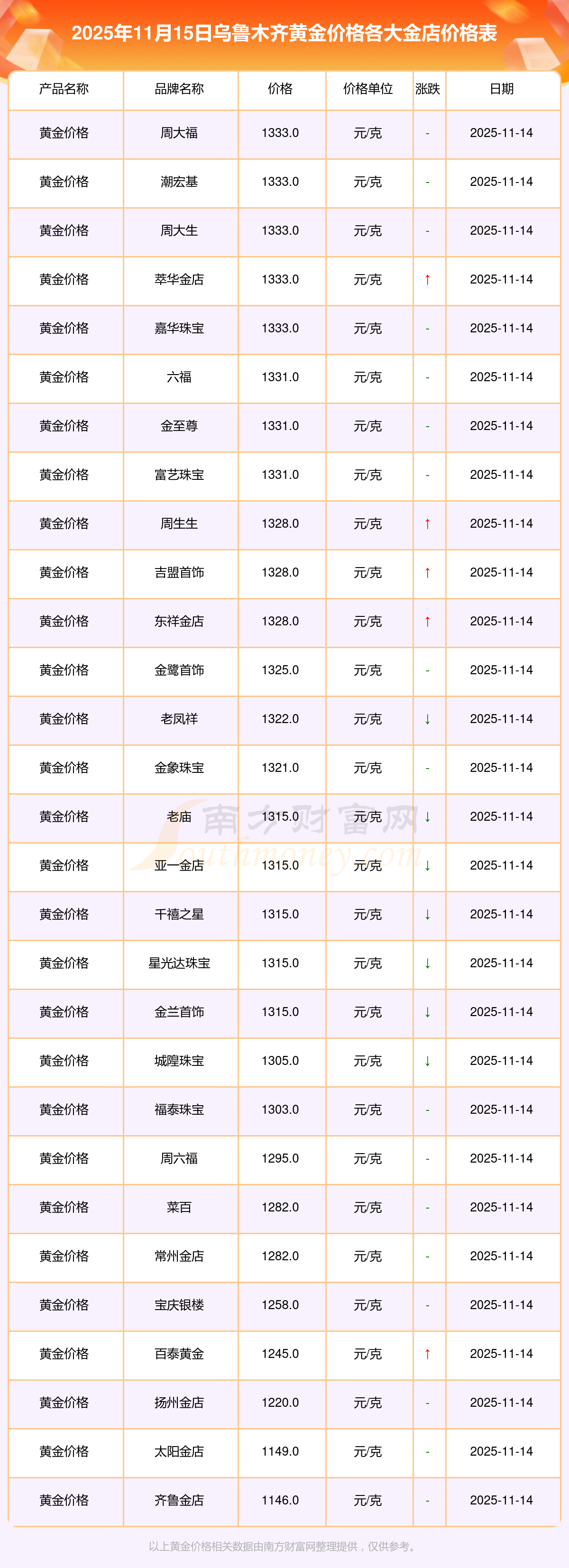 2025年11月15日乌鲁木齐周大福、周大福、周大福、周大福、周大福、周大福、周大福、老凤祥、老凤祥、老凤祥、周六福等各大金店品牌黄金价格最新价格如下:周大福黄金价格1333.0元/克,周大福铂金价格646.0元/克,周大福饰品金价(内地)1333.0元/克,周大福黄金饰品(香港)46320.0,周大福铂金价格(香港)18410.0,周大福金条价格(香港)41780.0,周大福金条金价(内地)1167.0元/克,老凤祥黄金价格1322.0元/克,老凤祥铂金价格600.0元/克,老凤祥足金价格1322.0元/克,周六福黄金价格1295.0元/克。