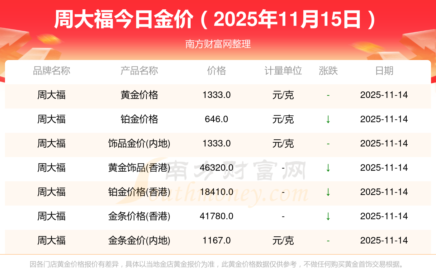 现在周大福黄金价格是多少钱1克_2025年周大福今日金价是多少钱一克,最新周大福查询,2025年11月15日周大福铂金价格现在每克多少钱?最新周大福铂金价格报价公布,一起来看看吧!