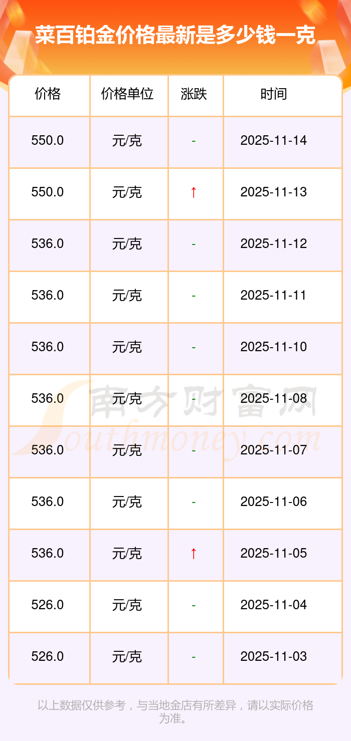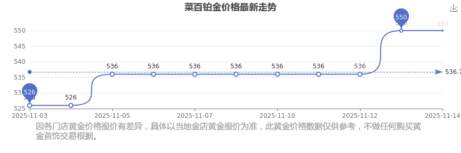 当下,菜百 铂金价格今日的最新价格是550.0元/克。