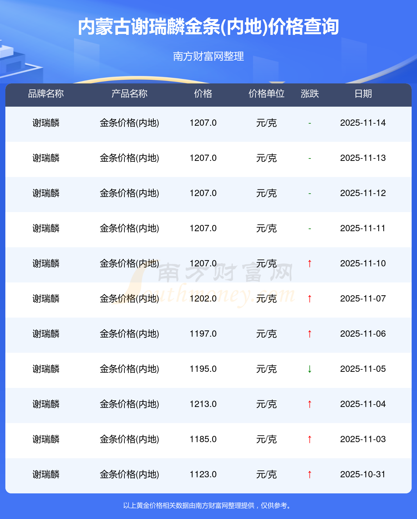 今日(2025年11月15日),内蒙古谢瑞麟金条价格(内地)的价格是1207.0元/克。