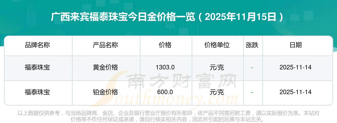 2025年11月15日广西来宾福泰珠宝每克黄金的市场价格是多少:黄金价格1333.0元/克,铂金价格646.0元/克,饰品金价(内地)1333.0元/克,黄金饰品(香港)46320.0,铂金价格(香港)18410.0,金条价格(香港)41780.0,金条金价(内地)1167.0元/克,黄金价格1322.0元/克,铂金价格600.0元/克,足金价格1322.0元/克,黄金价格1295.0元/克。
