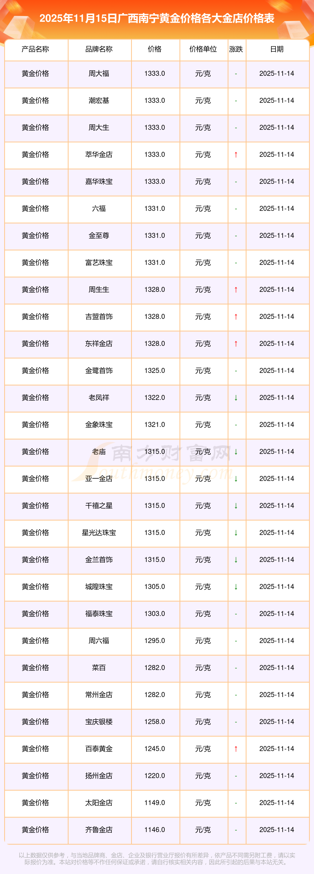 2025年11月15日广西南宁周大福、周大福、周大福、周大福、周大福、周大福、周大福、老凤祥、老凤祥、老凤祥、周六福等各大金店品牌黄金价格最新价格行情来了,如下:周大福黄金价格1333.0元/克,周大福铂金价格646.0元/克,周大福饰品金价(内地)1333.0元/克,周大福黄金饰品(香港)46320.0,周大福铂金价格(香港)18410.0,周大福金条价格(香港)41780.0,周大福金条金价(内地)1167.0元/克,老凤祥黄金价格1322.0元/克,老凤祥铂金价格600.0元/克,老凤祥足金价格1322.0元/克,周六福黄金价格1295.0元/克。
