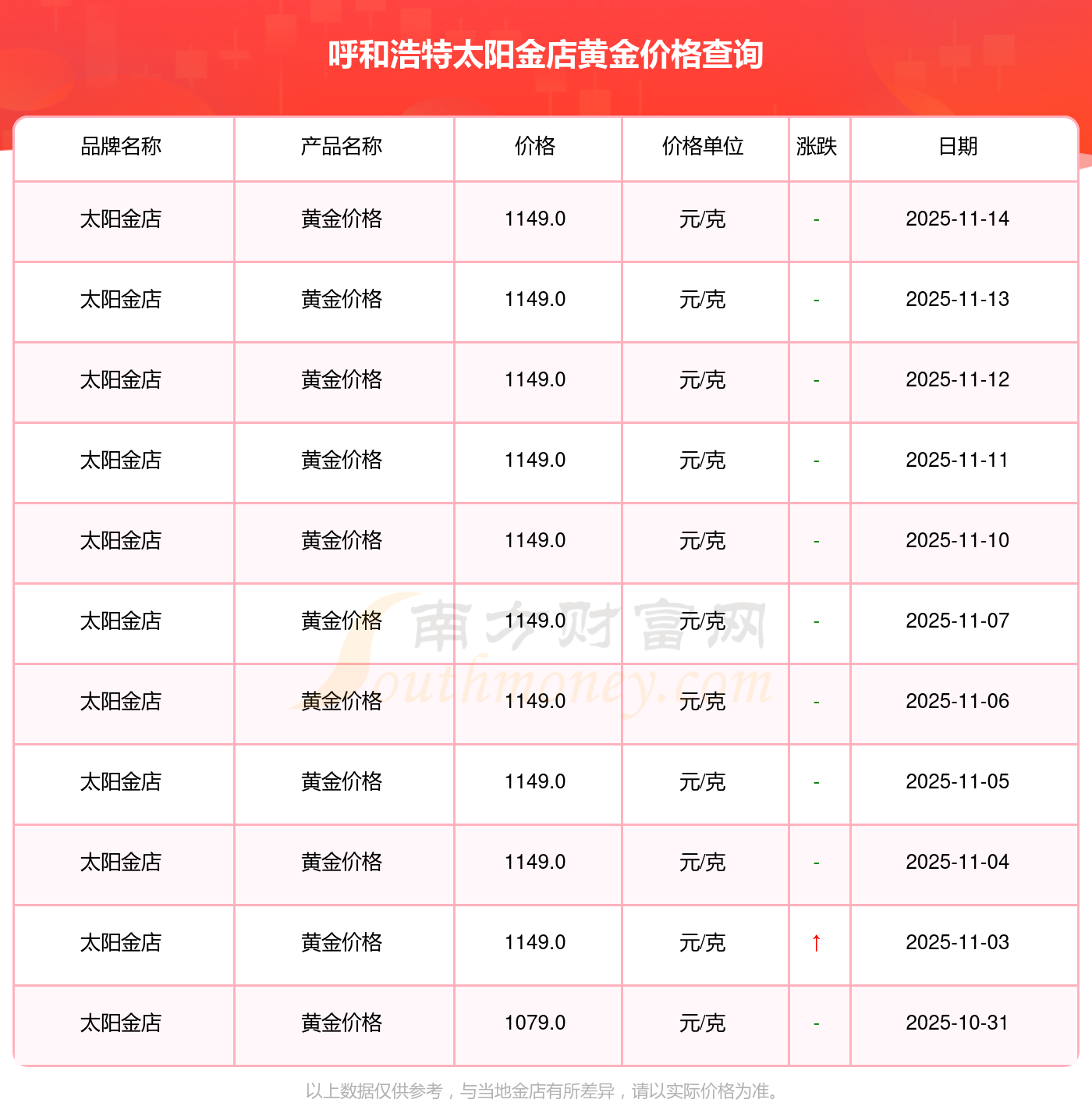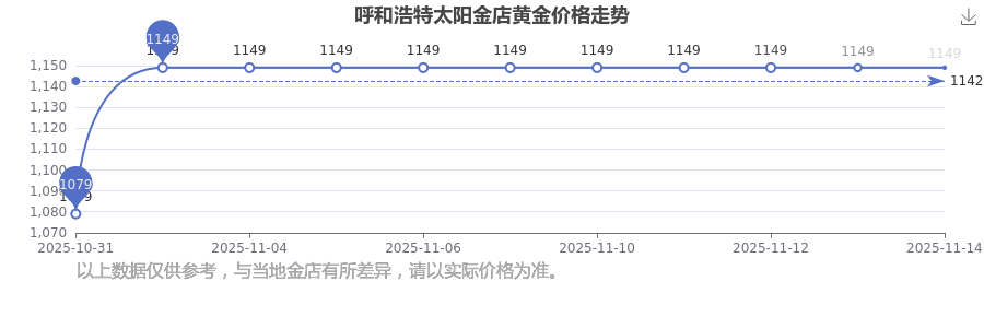 今日呼和浩特太阳金店黄金价格的价格为1149.0元/克。