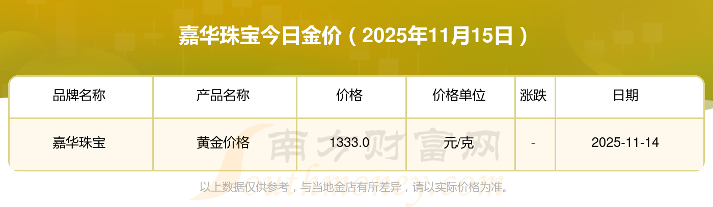 2025年11月15日嘉华珠宝今日价格:黄金价格1333.0元/克,铂金价格646.0元/克,饰品金价(内地)1333.0元/克,黄金饰品(香港)46320.0,铂金价格(香港)18410.0,金条价格(香港)41780.0,金条金价(内地)1167.0元/克,黄金价格1322.0元/克,铂金价格600.0元/克,足金价格1322.0元/克,黄金价格1295.0元/克。
