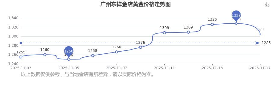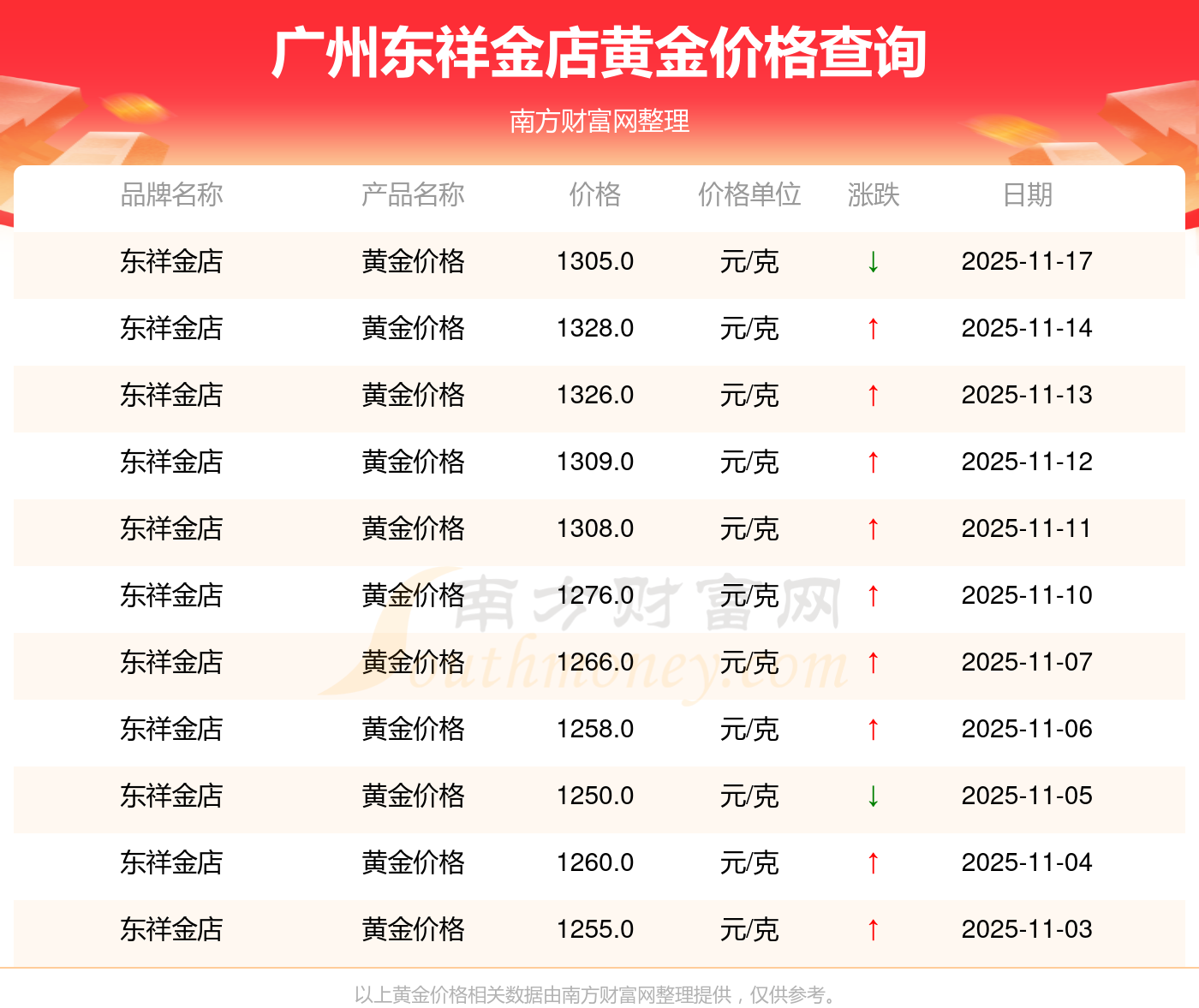 (2025年11月17日)广州东祥金店黄金价格现在为1305.0元/克。