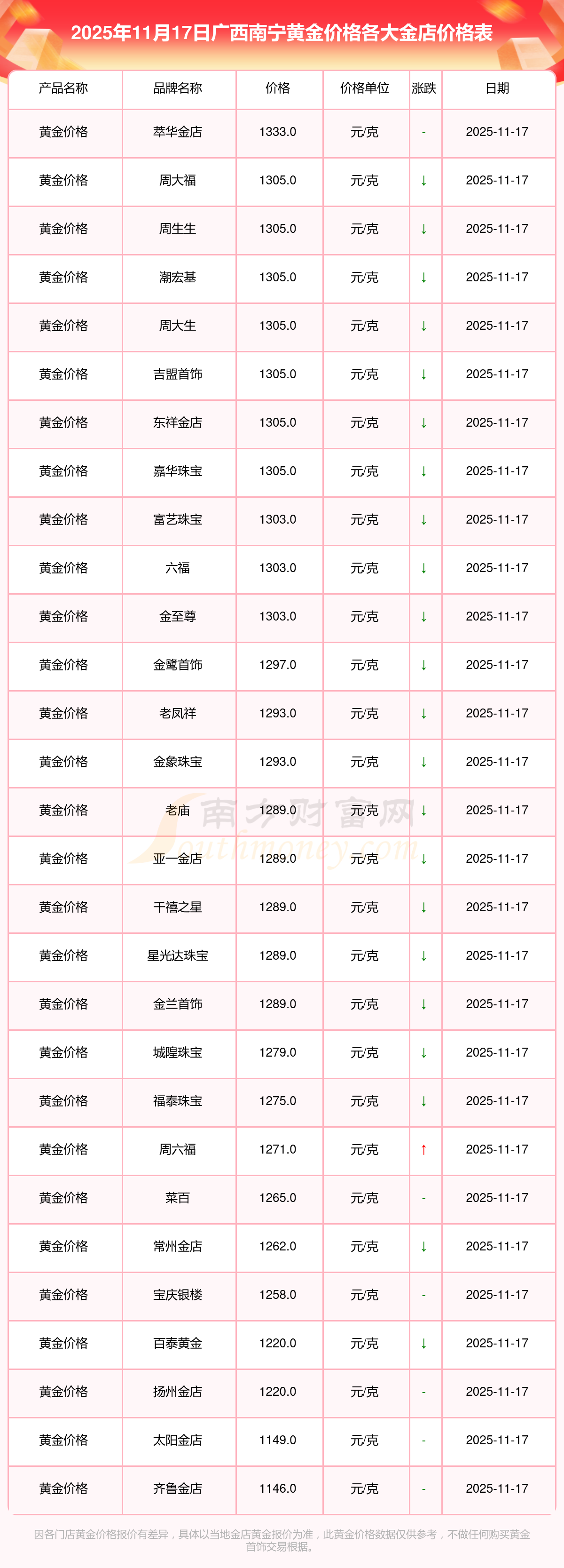 2025年11月17日广西南宁各大金店黄金价格最新价格查询来了:谢瑞麟1305.0元/克,谢瑞麟46270.0,谢瑞麟13490.0,谢瑞麟41990.0,金银街1280.0元/克,金银街1295.0元/克,金银街1285.0元/克,金银街11.5元/克,金银街921.0元/克,金银街10.7元/克,多边金都珠宝1256.0元/克。