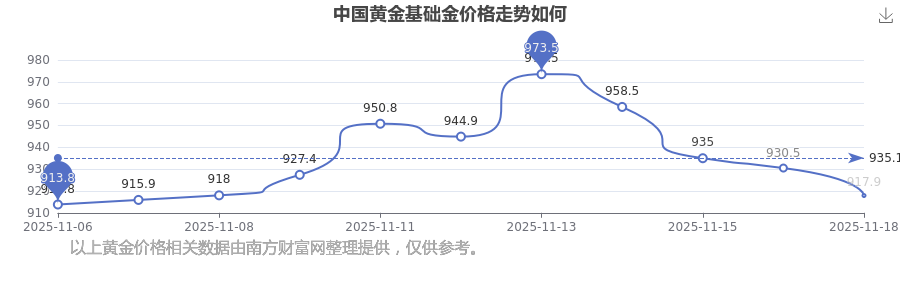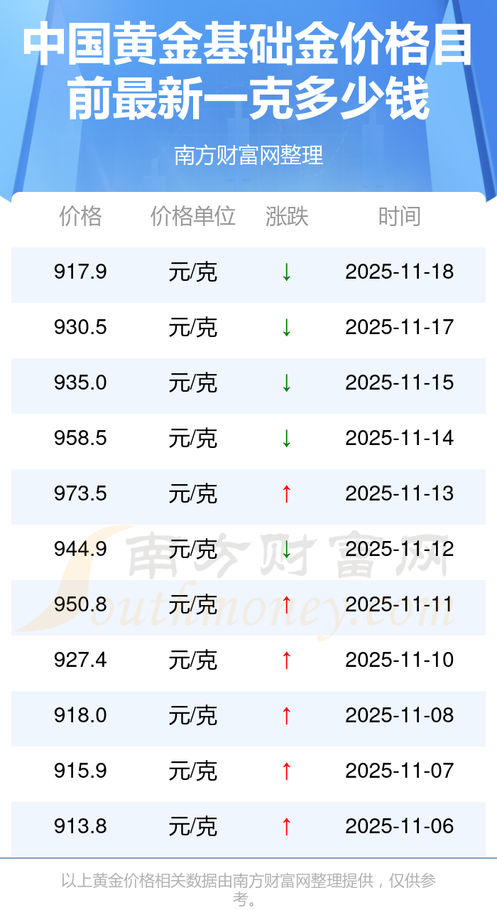 2025年11月18日中国黄金基础金价格最新是917.9元/克。