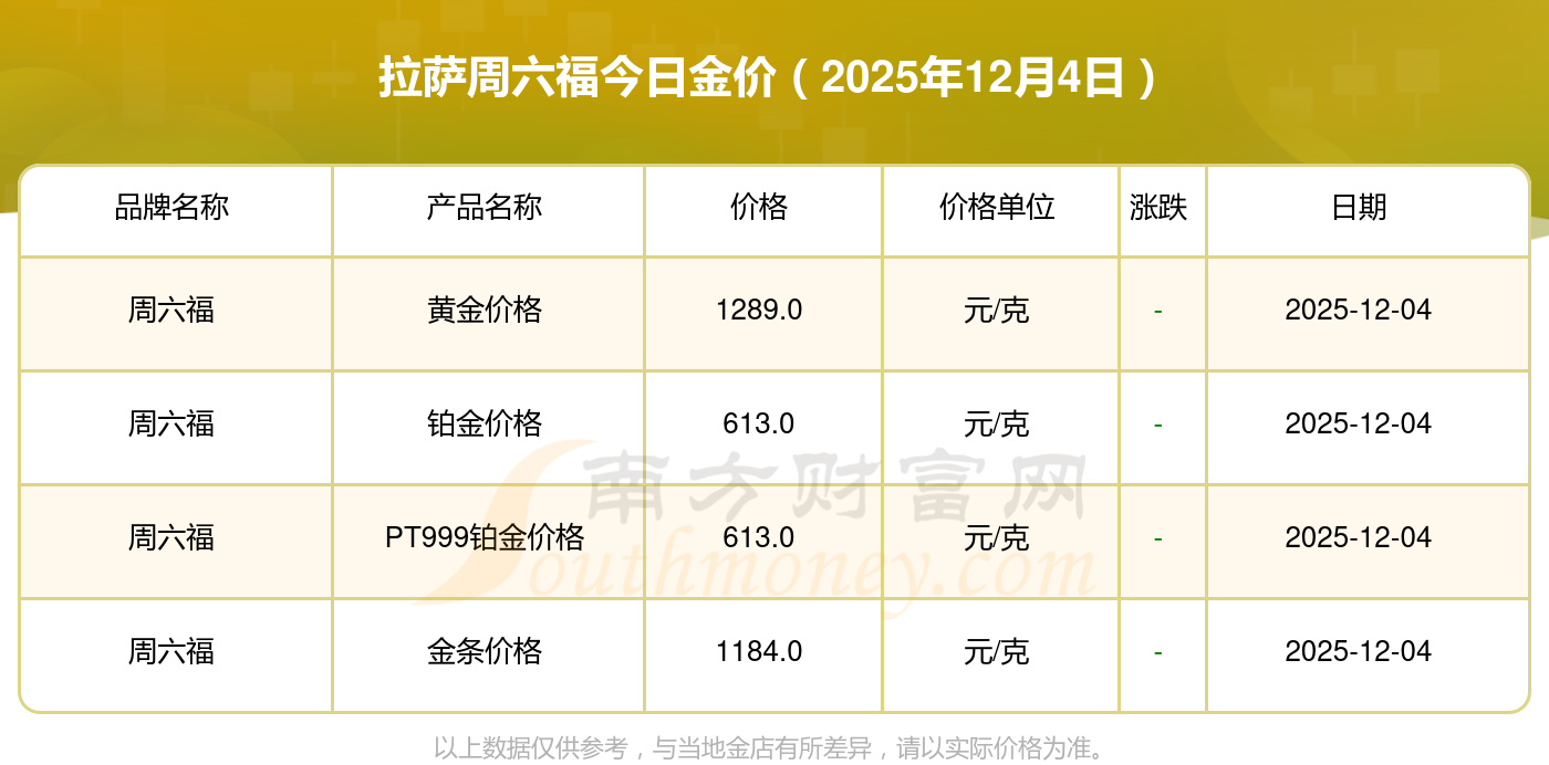 今天黄金价位是多少?现在一克黄金的价格是多少呀?2025年12月4日拉萨周六福现在黄金一克要多少钱:黄金价格1328.0元/克,铂金价格671.0元/克,饰品金价(内地)1328.0元/克,黄金饰品(香港)46730.0,铂金价格(香港)19260.0,金条价格(香港)42160.0,金条金价(内地)1165.0元/克,黄金价格1325.0元/克,铂金价格600.0元/克,足金价格1325.0元/克,黄金价格1326.0元/克。