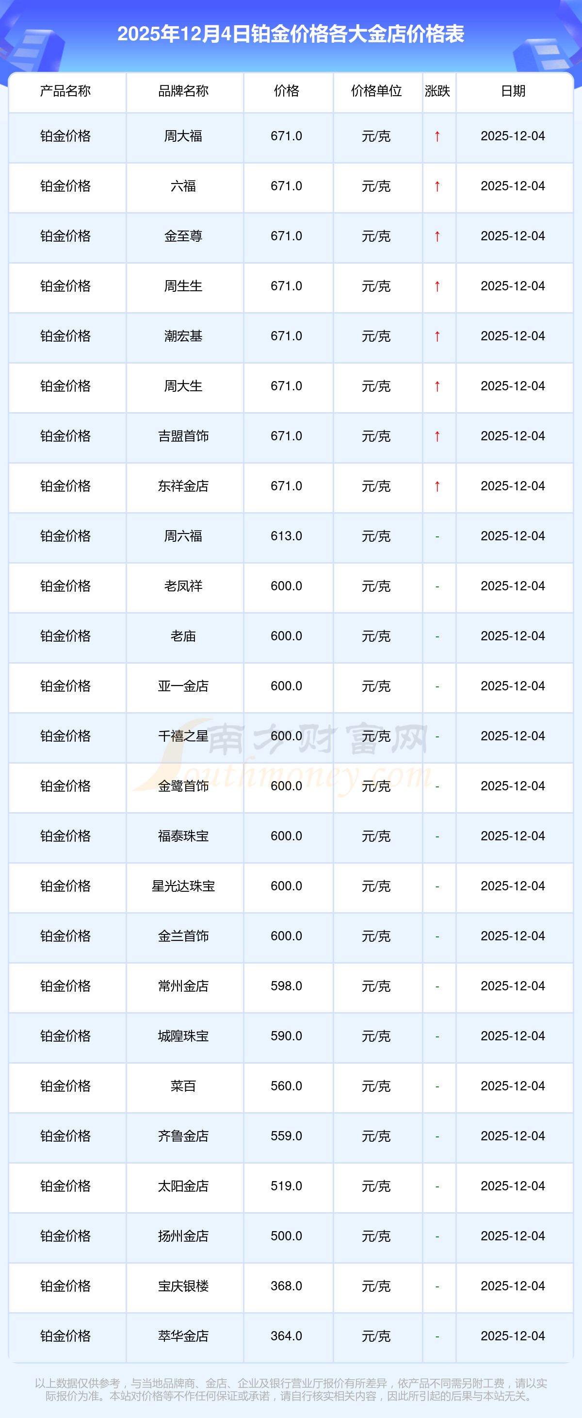 2025年12月4日,周大福、周大福、周大福、周大福、周大福、周大福、周大福、老凤祥、老凤祥、老凤祥、六福等各大金店品牌铂金价格今日价格如下:周大福1328.0元/克、周大福671.0元/克、周大福1328.0元/克、周大福46730.0、周大福19260.0、周大福42160.0、周大福1165.0元/克、老凤祥1325.0元/克、老凤祥600.0元/克、老凤祥1325.0元/克、六福1326.0元/克。