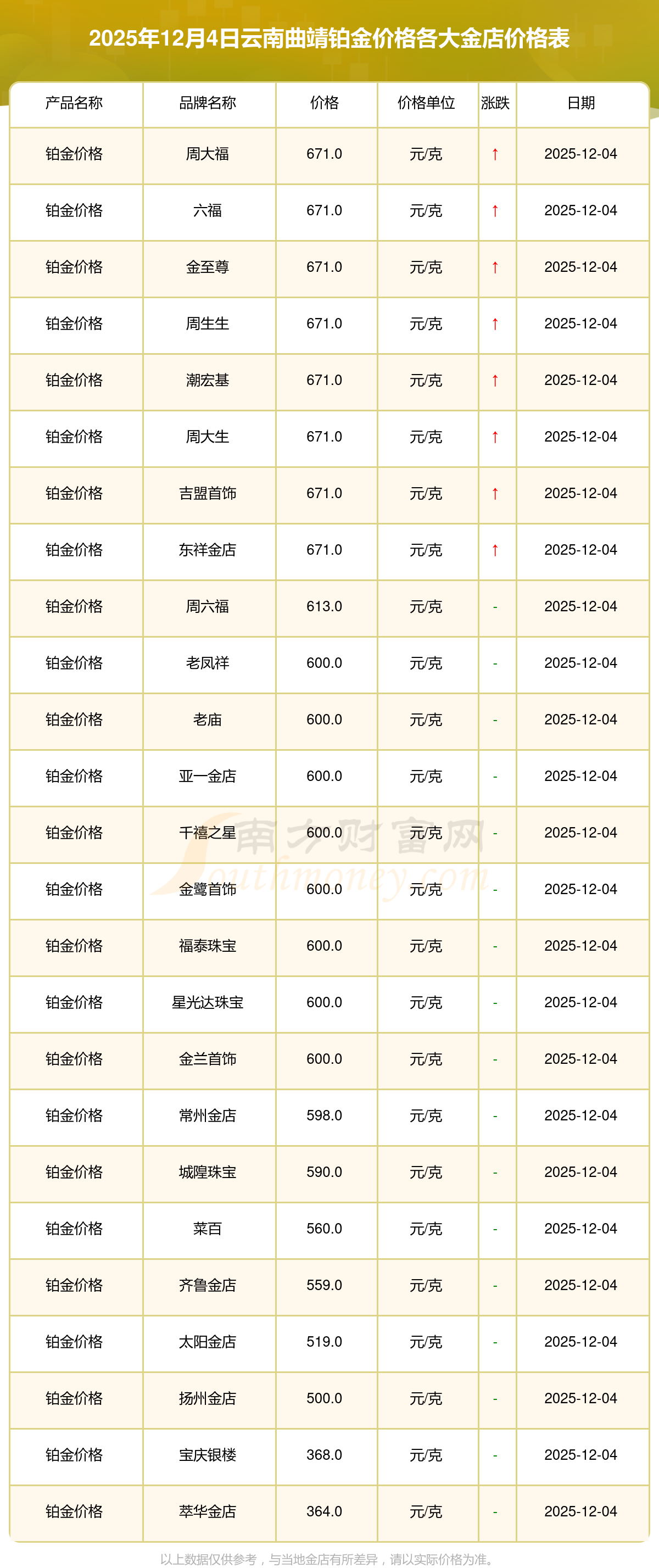 一、铂金价格今日价格表,云南曲靖各大品牌金店今日铂金价格多少钱一克(2025年12月4日)