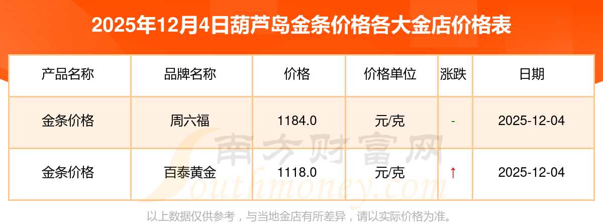 今天是2025年12月4日,葫芦岛周大福、周大福、周大福、周大福、周大福、周大福、周大福、老凤祥、老凤祥、老凤祥、六福等各大金店品牌金条价格最新价格行情是这样的:周大福1328.0元/克、周大福671.0元/克、周大福1328.0元/克、周大福46730.0、周大福19260.0、周大福42160.0、周大福1165.0元/克、老凤祥1325.0元/克、老凤祥600.0元/克、老凤祥1325.0元/克、六福1326.0元/克。