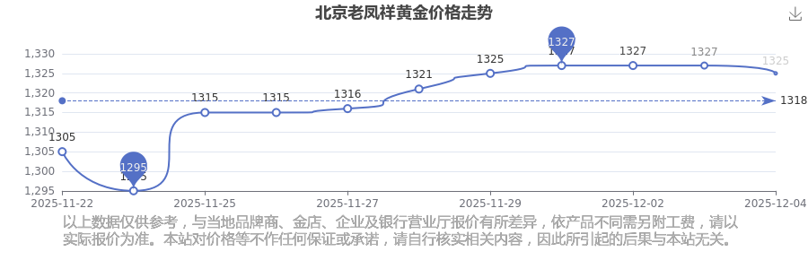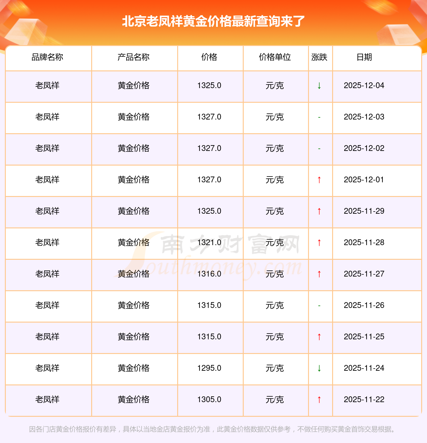 北京老凤祥现在黄金价格多少钱1克,此刻黄金一克的价格是多少?今日北京老凤祥黄金价格查询,北京老凤祥的黄金价格在今日(2025年12月4日),每克售价为1325.0元/克。