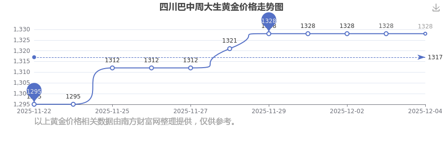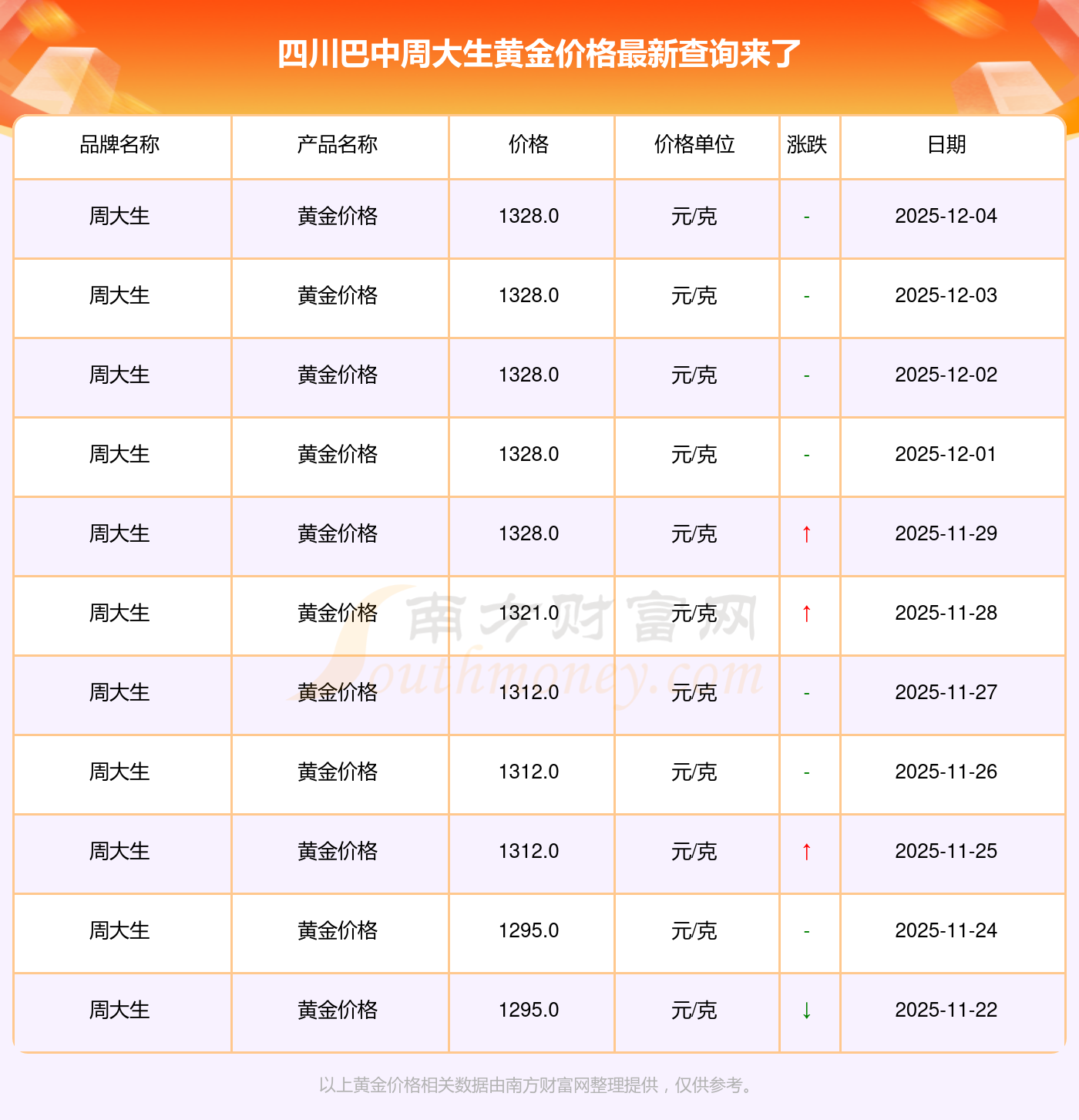 (2025年12月4日)今日四川巴中周大生黄金价格是1328.0元/克。