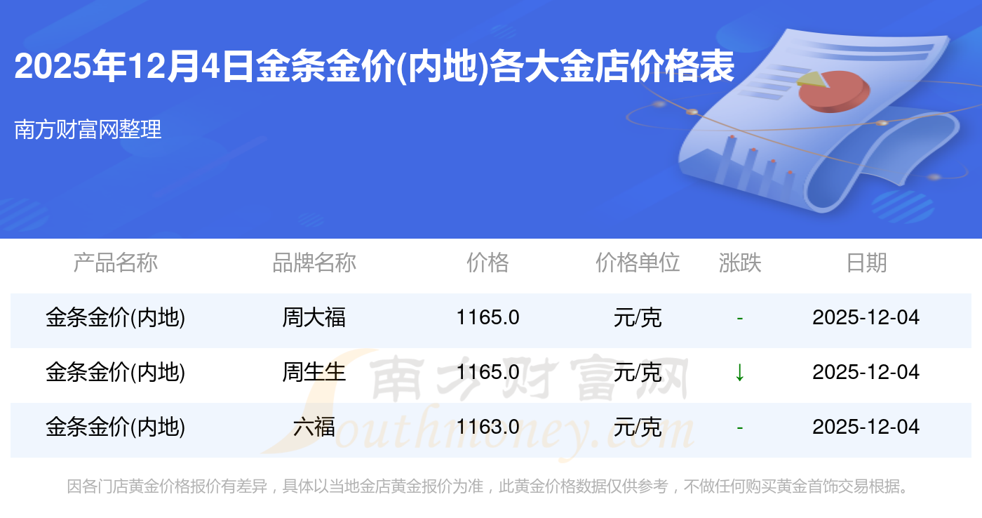 2025年12月4日各大金店金条金价(内地)最新价格:周大福1328.0元/克,周大福671.0元/克,周大福1328.0元/克,周大福46730.0,周大福19260.0,周大福42160.0,周大福1165.0元/克,老凤祥1325.0元/克,老凤祥600.0元/克,老凤祥1325.0元/克,六福1326.0元/克。