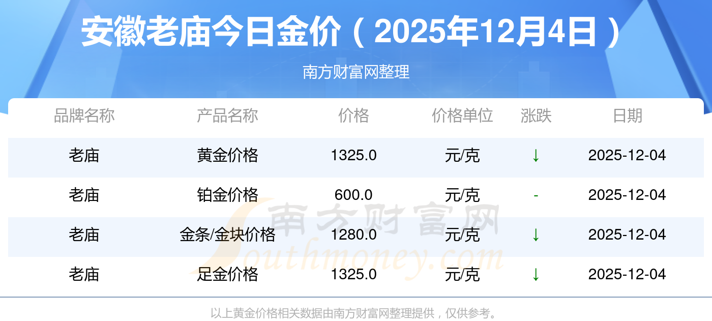 想了解此刻黄金价格,今天黄金一克的售价为多少?2025年12月4日安徽老庙一克黄金的售价是多少:黄金价格1328.0元/克,铂金价格671.0元/克,饰品金价(内地)1328.0元/克,黄金饰品(香港)46730.0,铂金价格(香港)19260.0,金条价格(香港)42160.0,金条金价(内地)1165.0元/克,黄金价格1325.0元/克,铂金价格600.0元/克,足金价格1325.0元/克,黄金价格1326.0元/克。