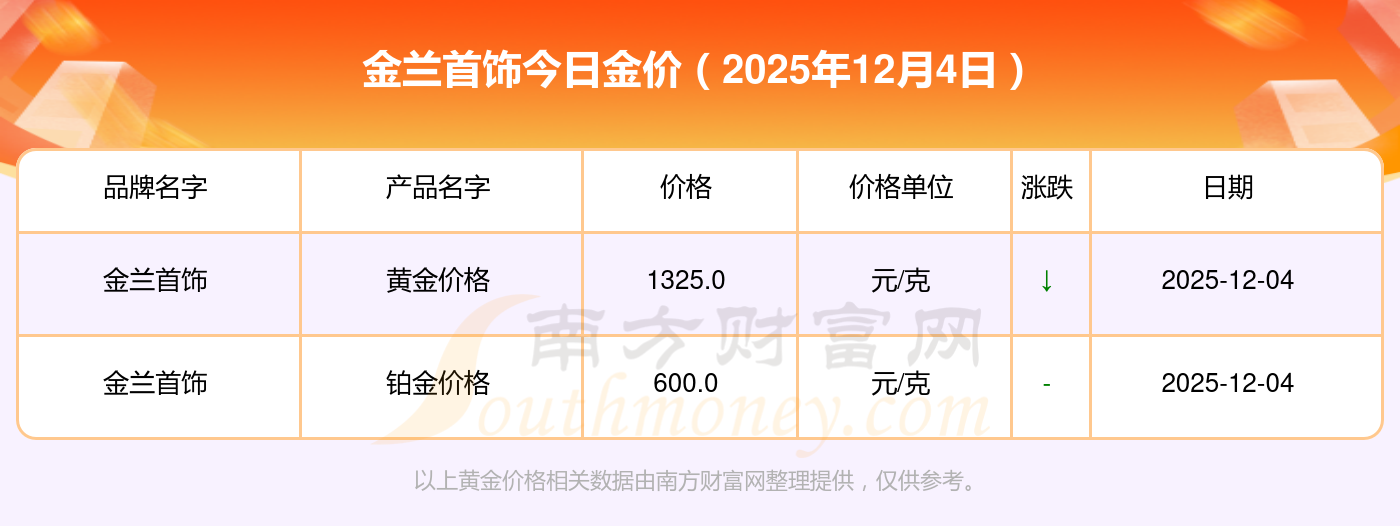 2025年12月4日各大金店铂金价格最新价格:周大福1328.0元/克,周大福671.0元/克,周大福1328.0元/克,周大福46730.0,周大福19260.0,周大福42160.0,周大福1165.0元/克,老凤祥1325.0元/克,老凤祥600.0元/克,老凤祥1325.0元/克,六福1326.0元/克。