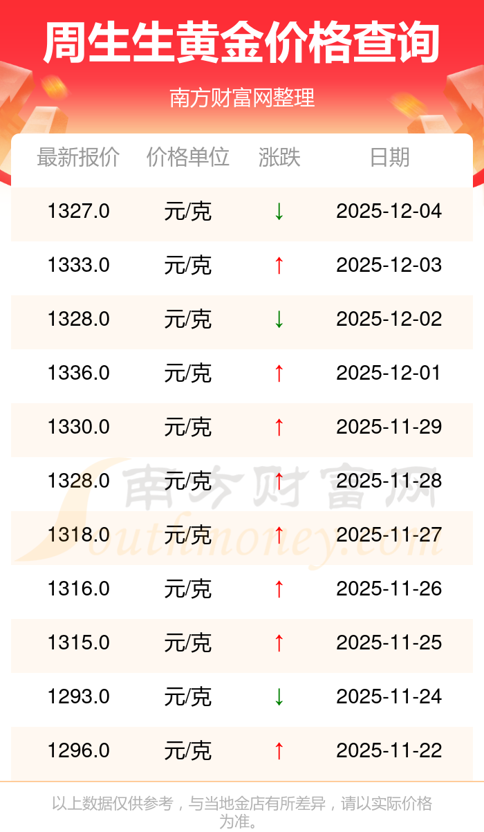 今日黄金价格查询_现在金价黄金一克多少钱,黄金价格是多少钱一克?黄金每一克的价位大概是多少呢?今日周生生 黄金价格最新的市场标价为1327.0元/克。