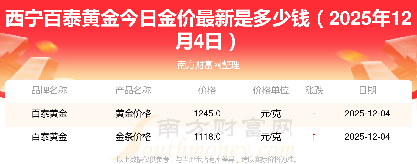想查询今天黄金价格,此刻黄金一克的价格是多少呀?2025年12月4日西宁百泰黄金一克黄金对应的价格是多少?黄金价格1328.0元/克,铂金价格671.0元/克,饰品金价(内地)1328.0元/克,黄金饰品(香港)46730.0,铂金价格(香港)19260.0,金条价格(香港)42160.0,金条金价(内地)1165.0元/克,黄金价格1325.0元/克,铂金价格600.0元/克,足金价格1325.0元/克,黄金价格1326.0元/克。