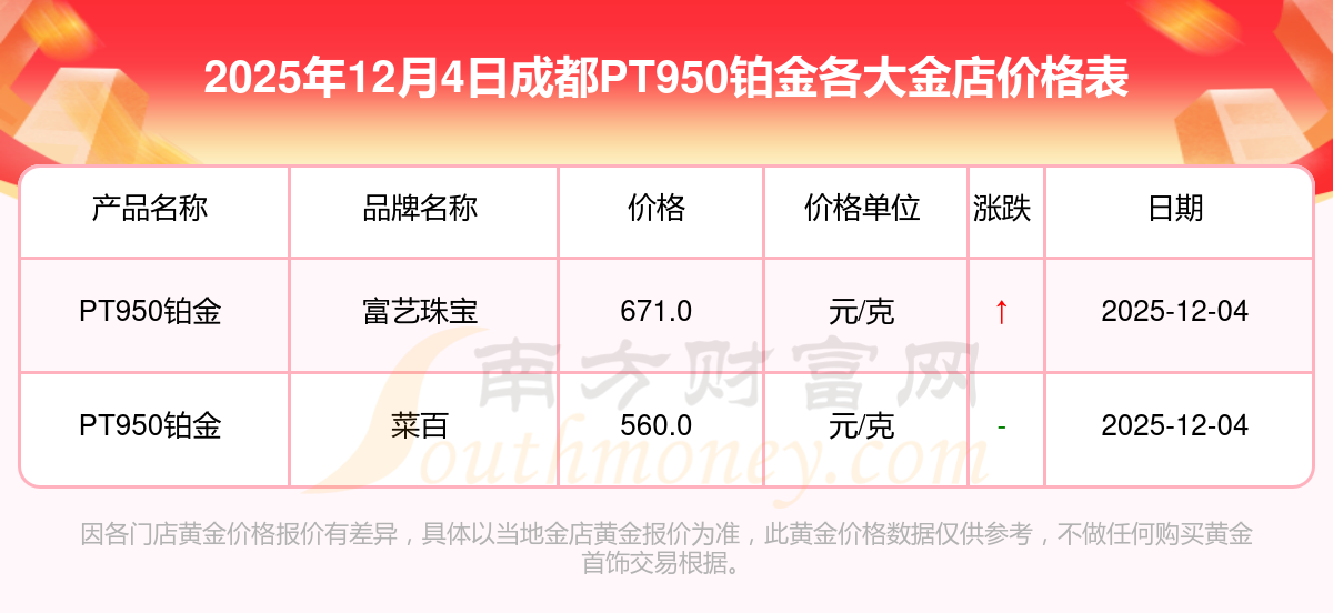 二、2025年12月4日今日成都各金店PT950铂金价格行情一览表