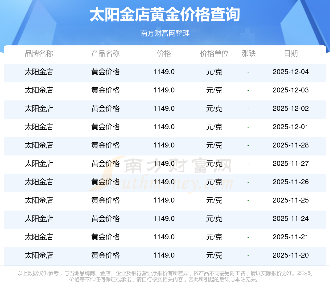当下,太阳金店 黄金价格今日的最新价格是1149.0元/克。