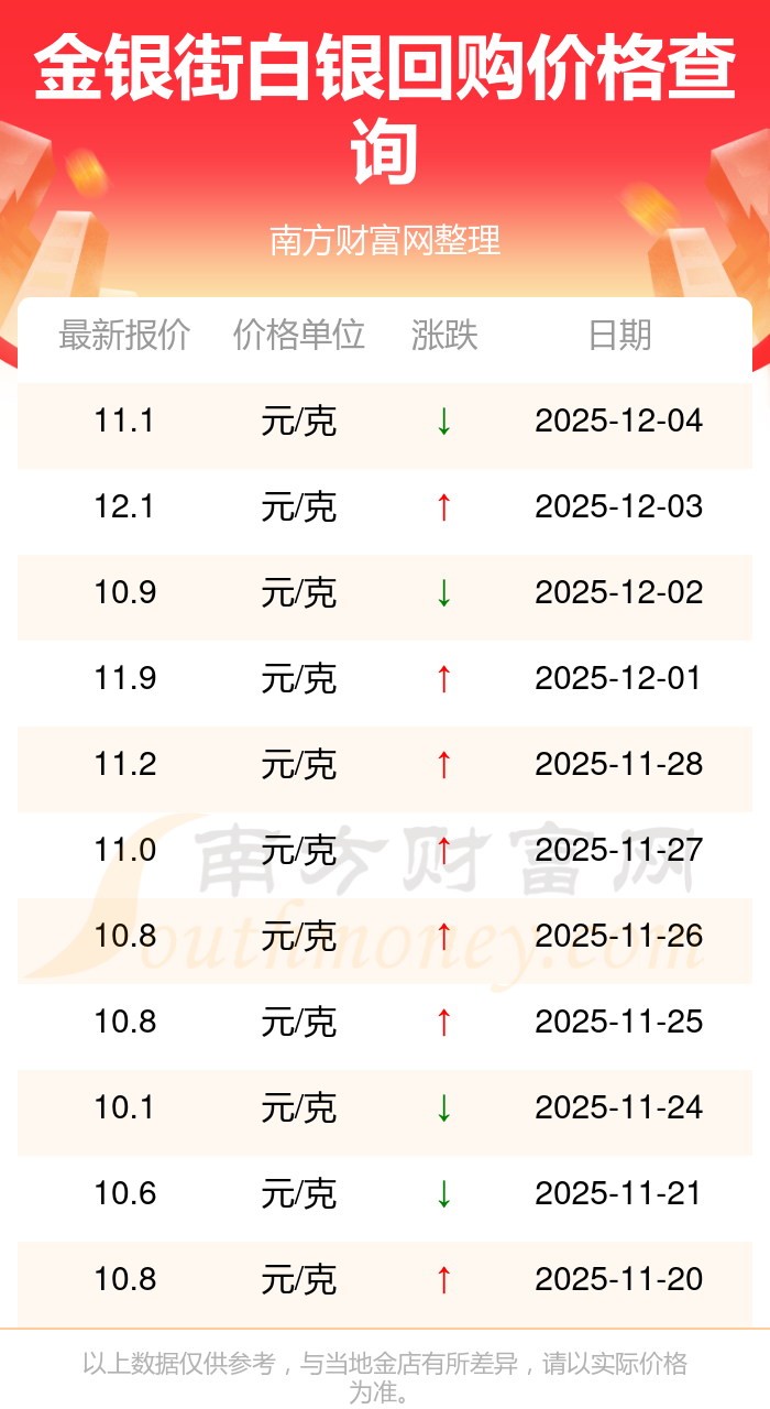 金银街今日白银回购的最新市场行情价为11.1元/克。