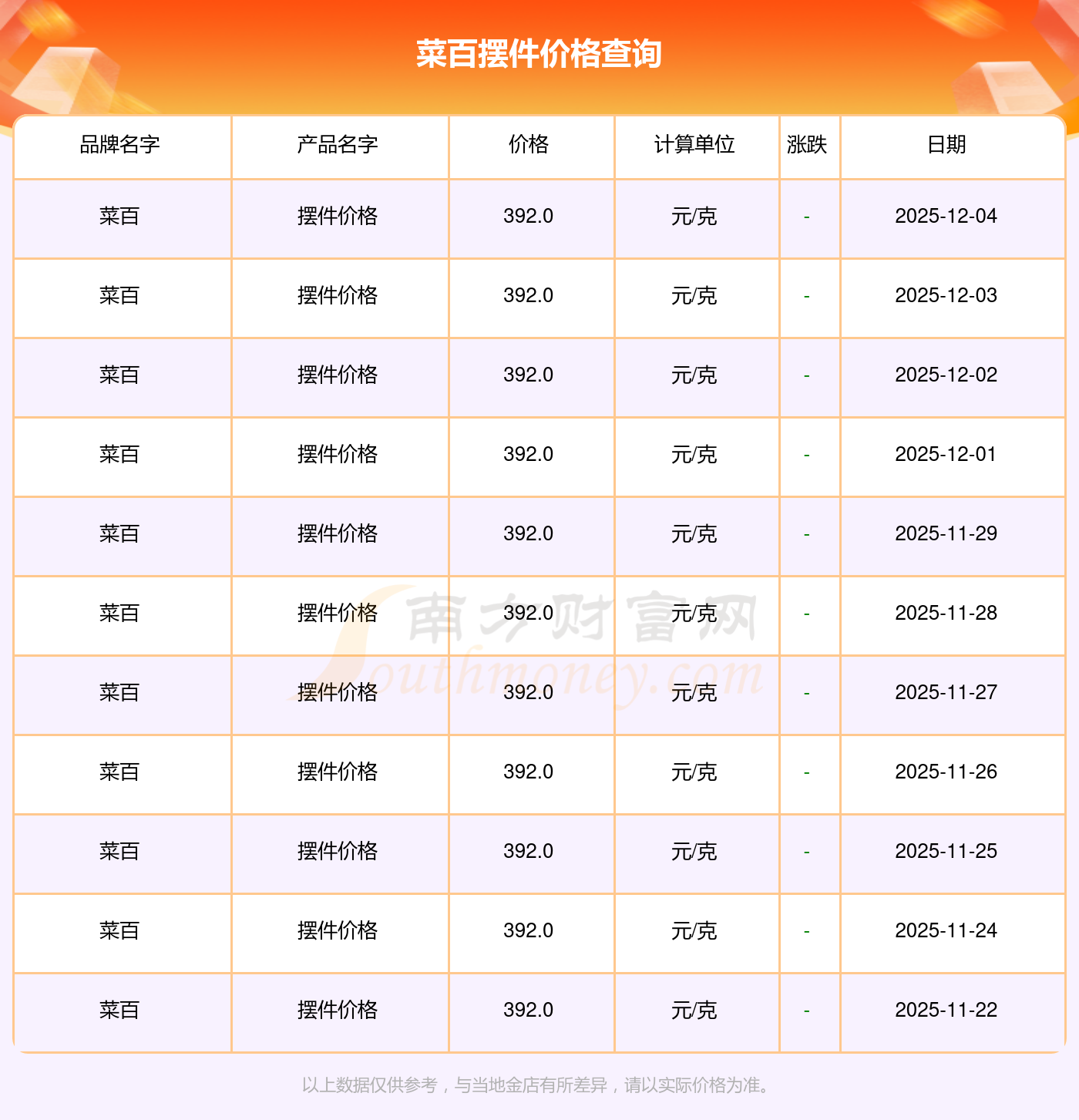 今日菜百 摆件价格最新的克重售价为392.0元/克。