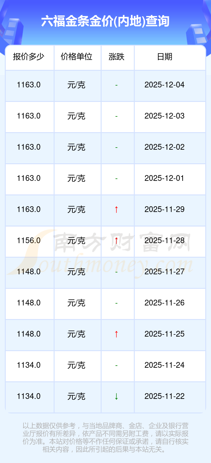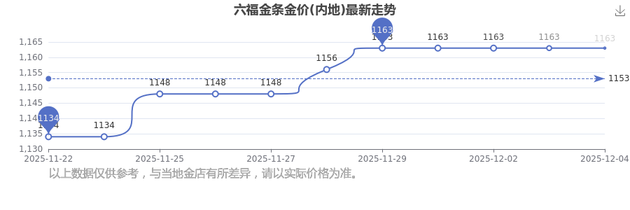今日(2025年12月5日)六福金条金价(内地)的价格为1163.0元/克。