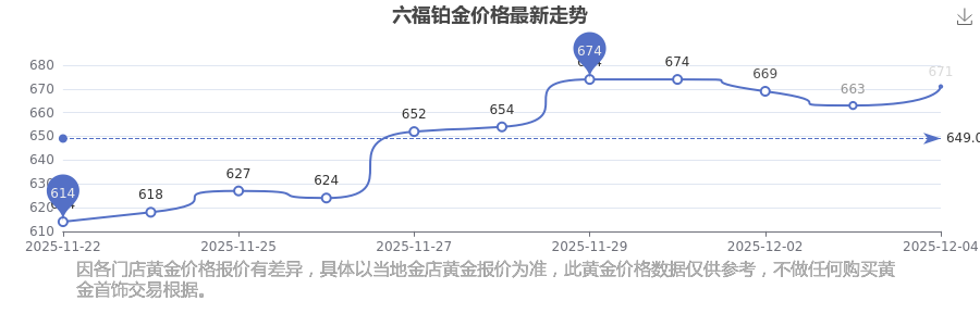 今日(2025年12月5日),六福铂金价格最新价格是671.0元/克。