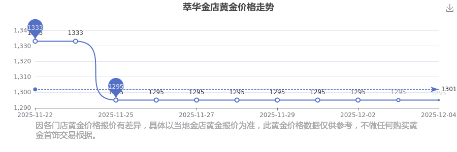 今天黄金价位是多少?现在一克黄金的价格是多少呀?黄金是种优良的导电导热材料,具有良好的导热特性。因其化学稳定性高、抗氧化性强,能够制作高精度电子元件,故而常用于电子工业中的特殊电路设计。今日萃华金店黄金价格是1295.0元/克。