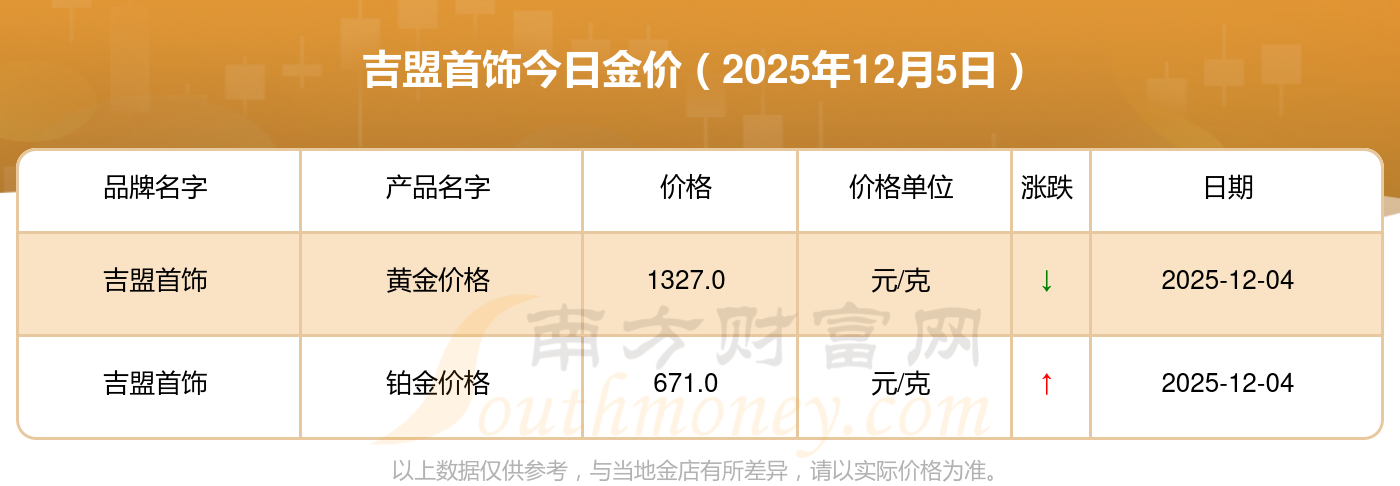 吉盟首饰金价今日价格:黄金价格1328.0元/克,铂金价格671.0元/克,饰品金价(内地)1328.0元/克,黄金饰品(香港)46730.0,铂金价格(香港)19260.0,金条价格(香港)42160.0,金条金价(内地)1165.0元/克,黄金价格1325.0元/克,铂金价格600.0元/克,足金价格1325.0元/克,黄金价格1326.0元/克。