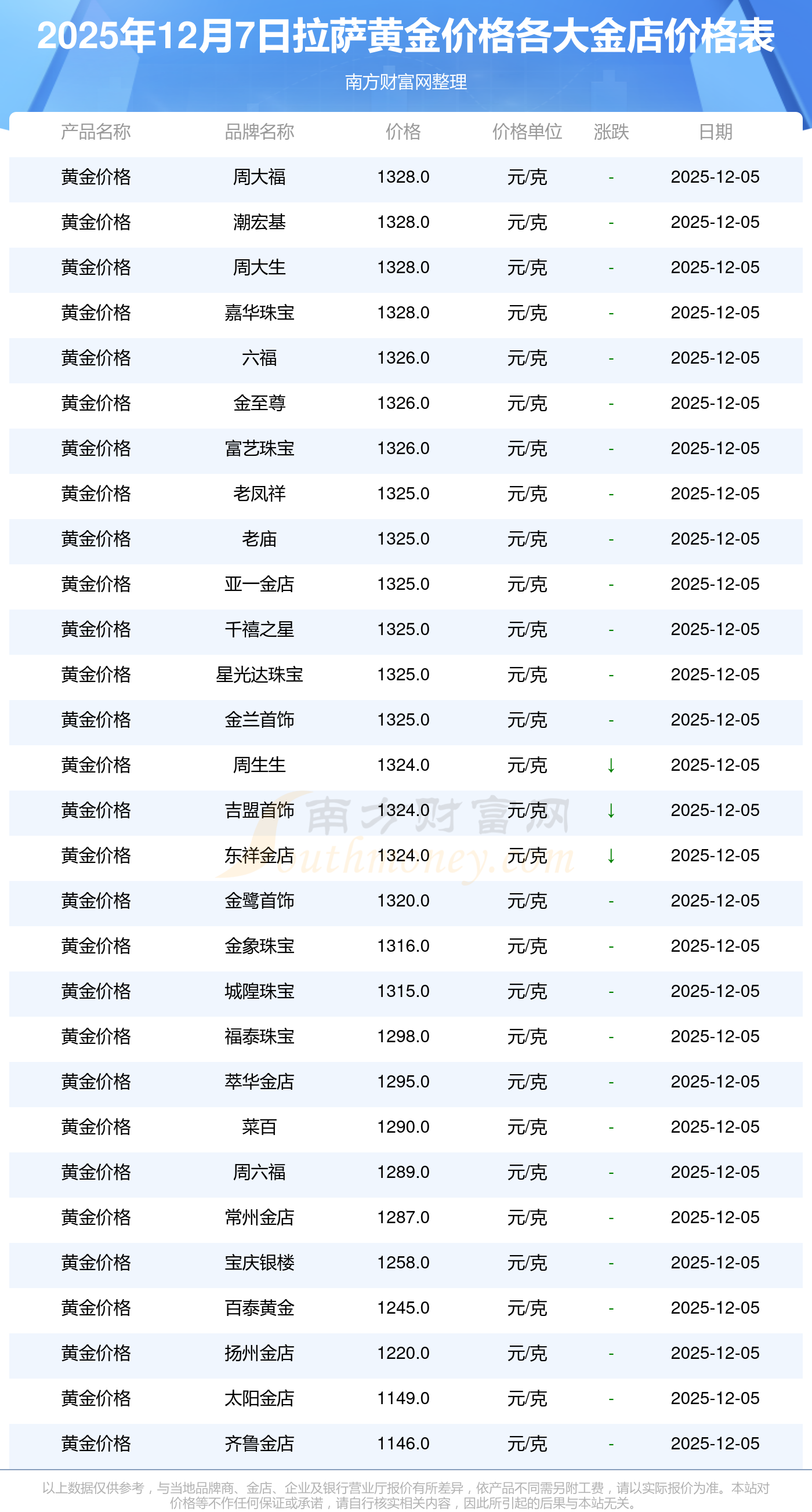 今天是2025年12月7日,拉萨周大福、周大福、周大福、周大福、周大福、周大福、周大福、老凤祥、老凤祥、老凤祥、周六福等各大金店品牌黄金价格最新价格行情是这样的:周大福1328.0元/克、周大福662.0元/克、周大福1328.0元/克、周大福46550.0、周大福18970.0、周大福41990.0、周大福1165.0元/克、老凤祥1325.0元/克、老凤祥600.0元/克、老凤祥1325.0元/克、周六福1289.0元/克。