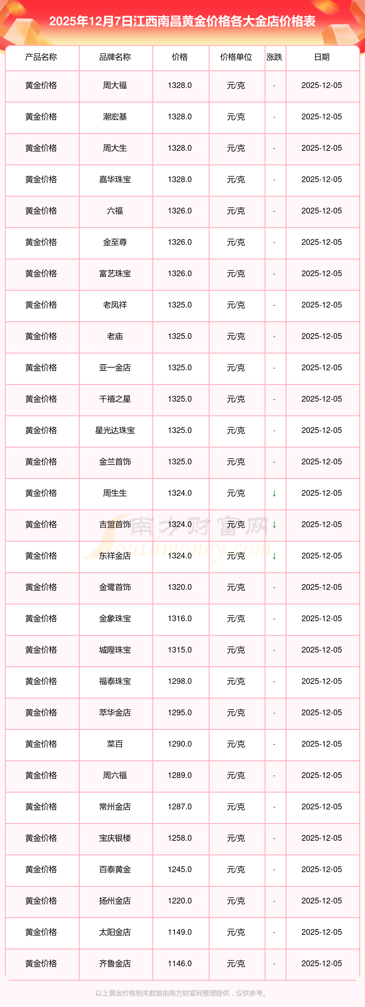 2025年12月7日江西南昌各大金店黄金价格最新价格:周大福1328.0元/克,周大福662.0元/克,周大福1328.0元/克,周大福46550.0,周大福18970.0,周大福41990.0,周大福1165.0元/克,老凤祥1325.0元/克,老凤祥600.0元/克,老凤祥1325.0元/克,周六福1289.0元/克。