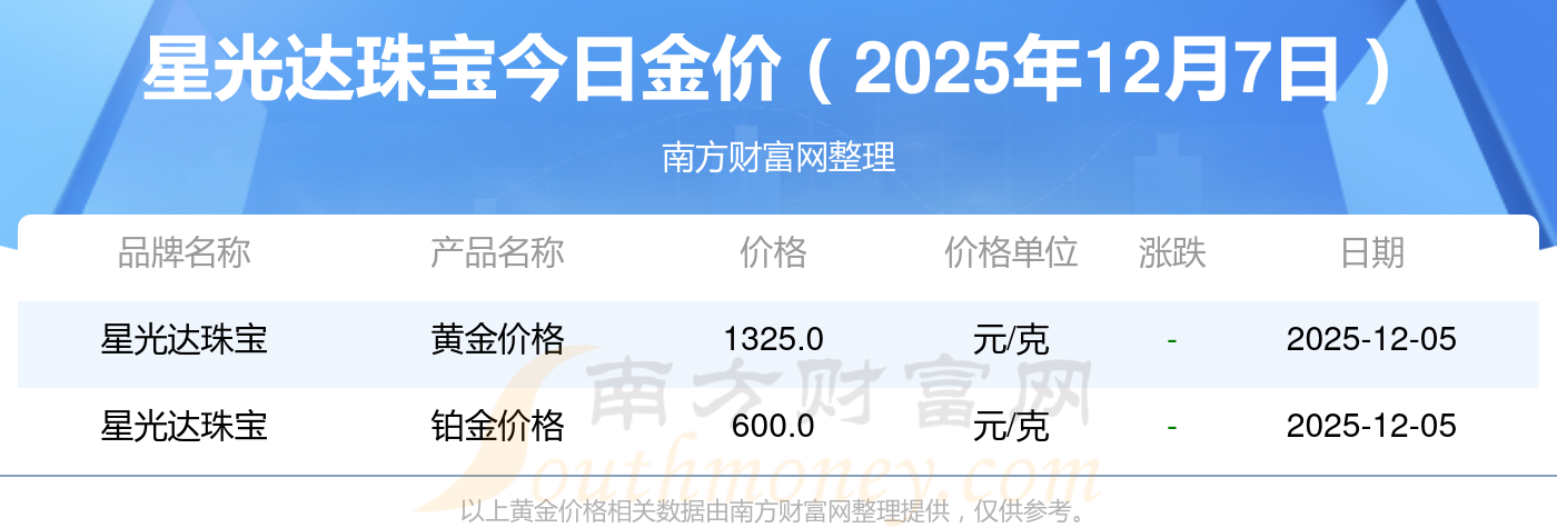 2025年12月7日星光达珠宝最新价格:黄金价格1328.0元/克,铂金价格662.0元/克,饰品金价(内地)1328.0元/克,黄金饰品(香港)46550.0,铂金价格(香港)18970.0,金条价格(香港)41990.0,金条金价(内地)1165.0元/克,黄金价格1325.0元/克,铂金价格600.0元/克,足金价格1325.0元/克,黄金价格1289.0元/克。