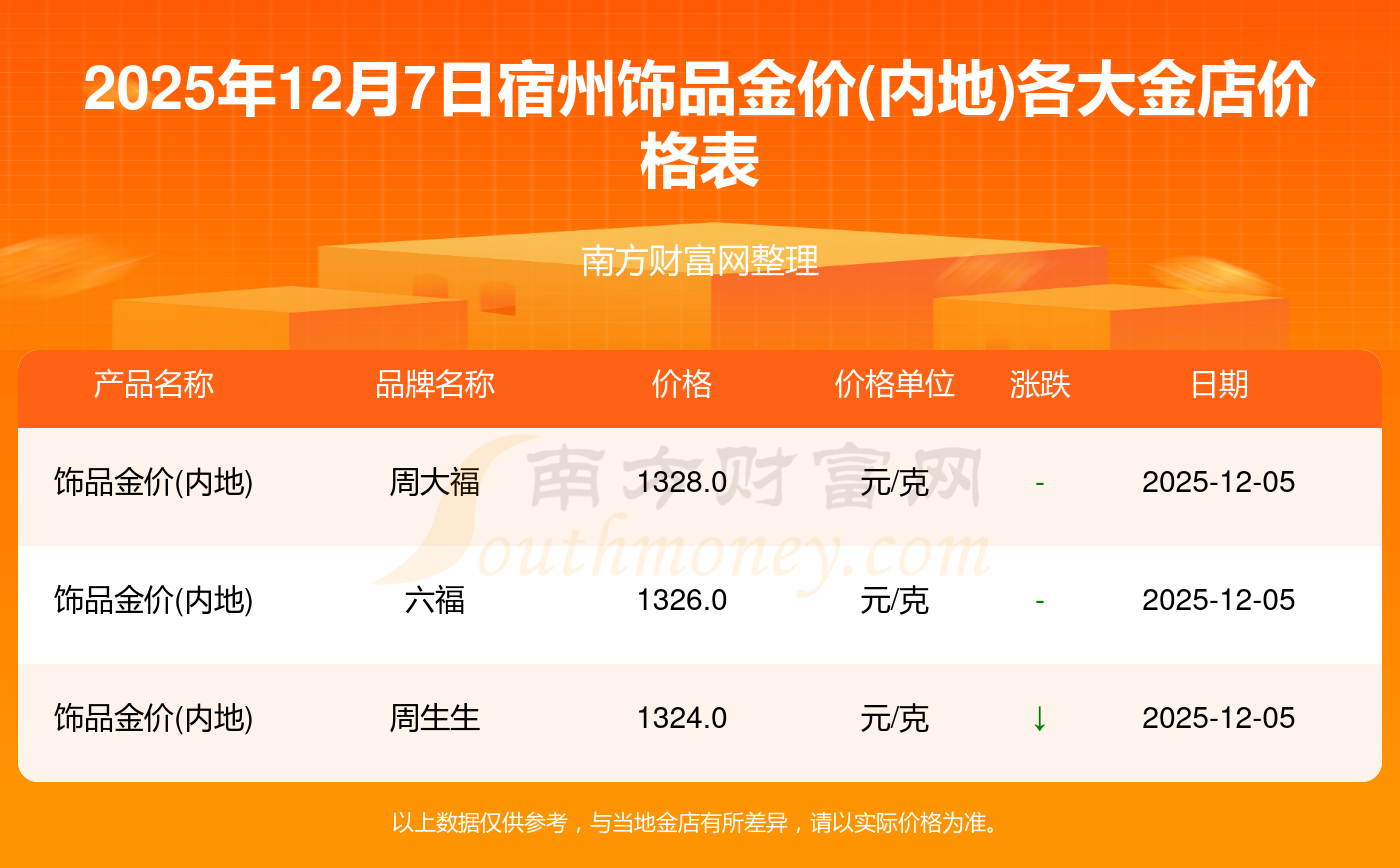 2025年12月7日宿州各大金店饰品金价(内地)最新价格查询来了:周大福1328.0元/克,周大福662.0元/克,周大福1328.0元/克,周大福46550.0,周大福18970.0,周大福41990.0,周大福1165.0元/克,老凤祥1325.0元/克,老凤祥600.0元/克,老凤祥1325.0元/克,周六福1289.0元/克。