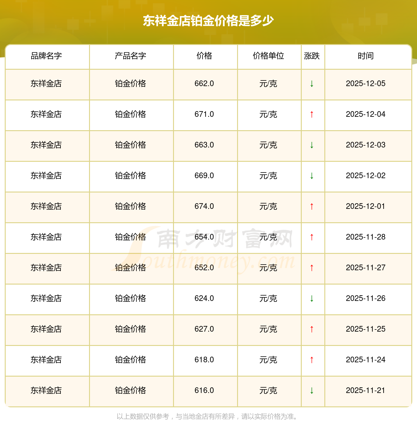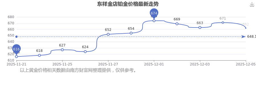 今日东祥金店 铂金价格的最新定价为662.0元/克。