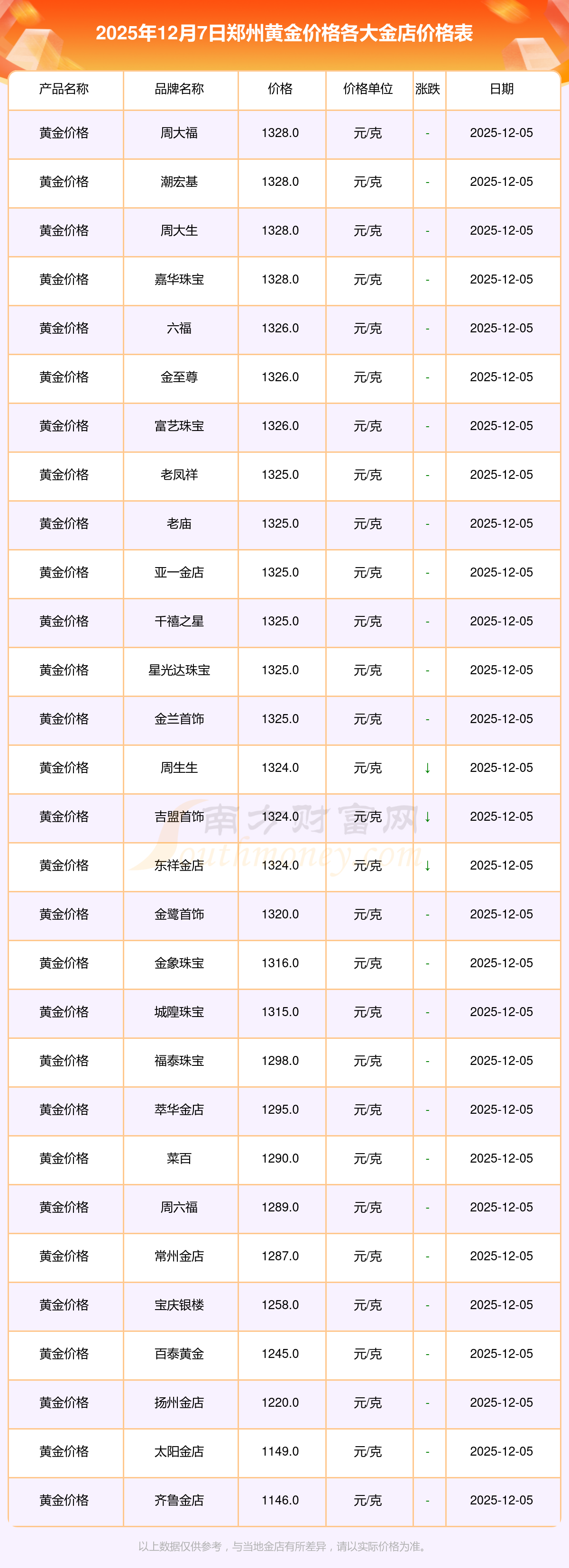 2025年12月7日,郑州周大福、周大福、周大福、周大福、周大福、周大福、周大福、老凤祥、老凤祥、老凤祥、周六福等各大金店品牌黄金价格今日价格如下:周大福1328.0元/克、周大福662.0元/克、周大福1328.0元/克、周大福46550.0、周大福18970.0、周大福41990.0、周大福1165.0元/克、老凤祥1325.0元/克、老凤祥600.0元/克、老凤祥1325.0元/克、周六福1289.0元/克。