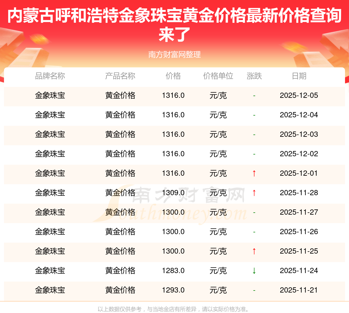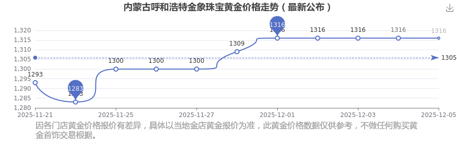 今日(2025年12月7日),内蒙古呼和浩特金象珠宝黄金价格的价格是1316.0元/克。