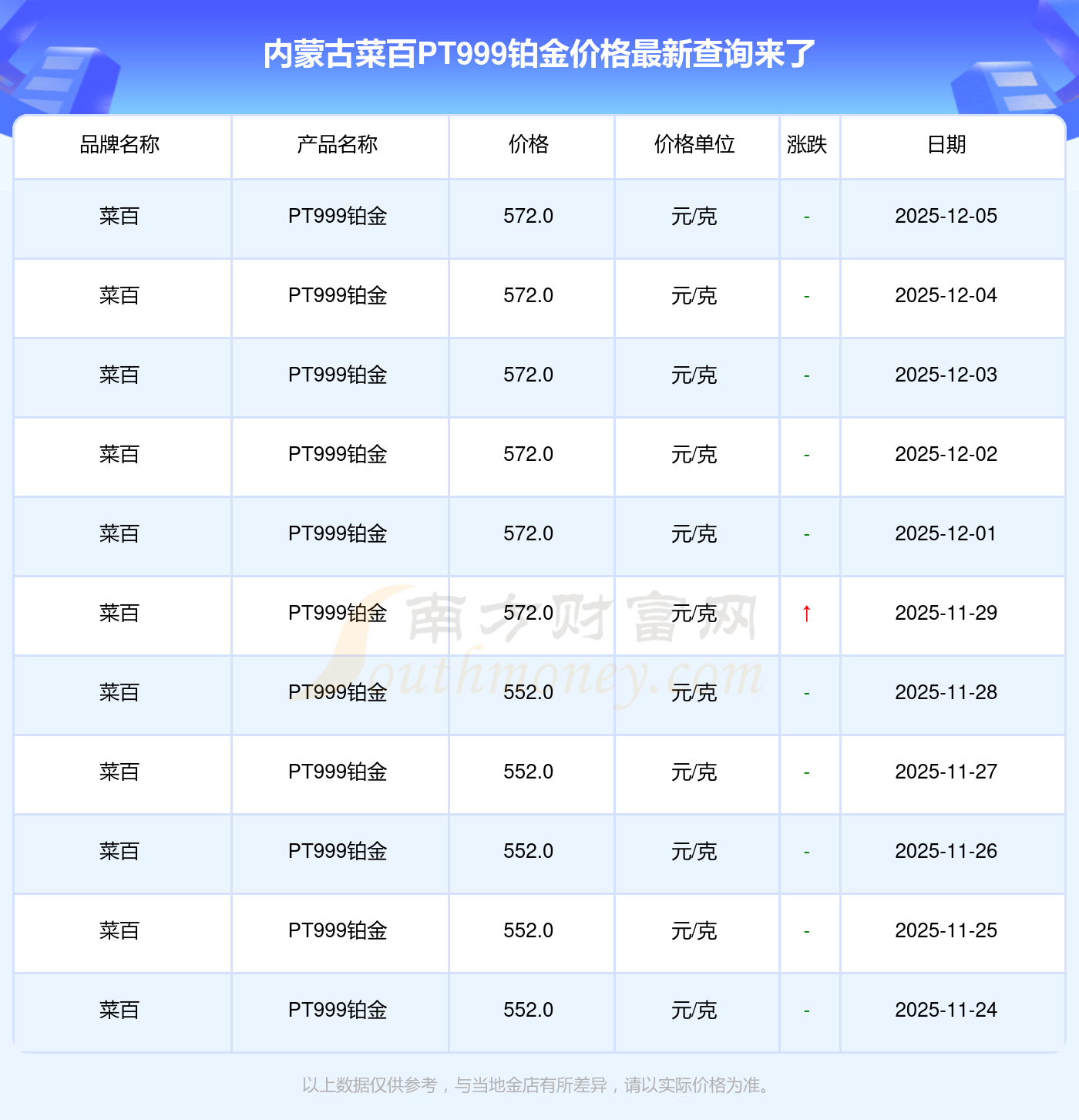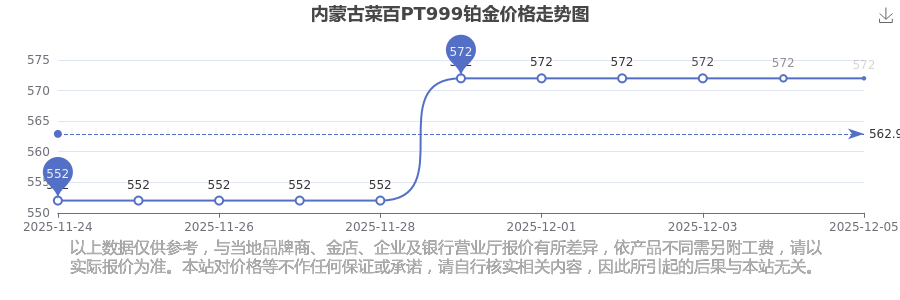内蒙古菜百在 2025年12月7日,PT999铂金的售卖价格是 572.0元/克。