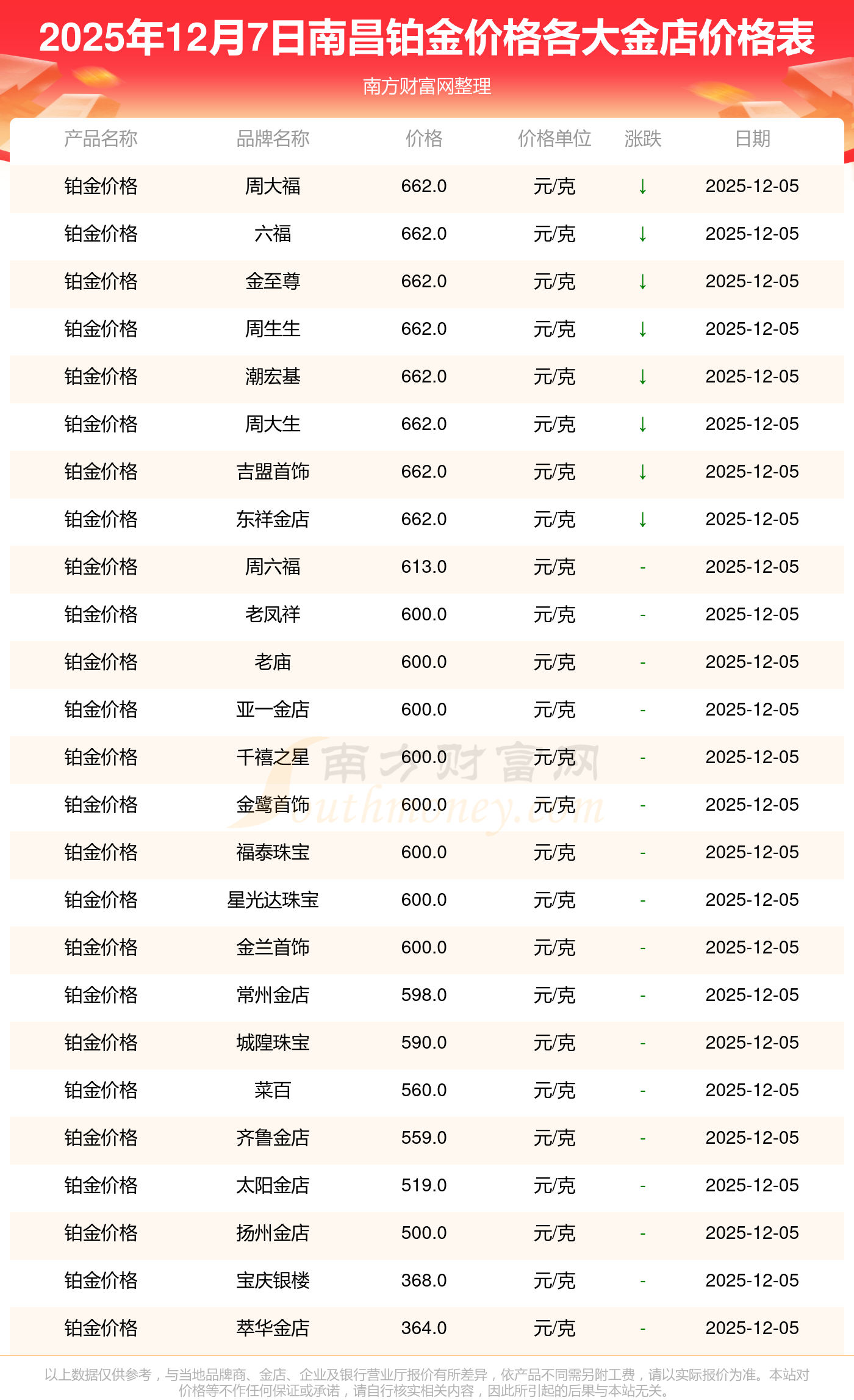 2025年12月7日,南昌周大福、周大福、周大福、周大福、周大福、周大福、周大福、老凤祥、老凤祥、老凤祥、周六福等各大金店品牌铂金价格今日价格如下:周大福1328.0元/克、周大福662.0元/克、周大福1328.0元/克、周大福46550.0、周大福18970.0、周大福41990.0、周大福1165.0元/克、老凤祥1325.0元/克、老凤祥600.0元/克、老凤祥1325.0元/克、周六福1289.0元/克。