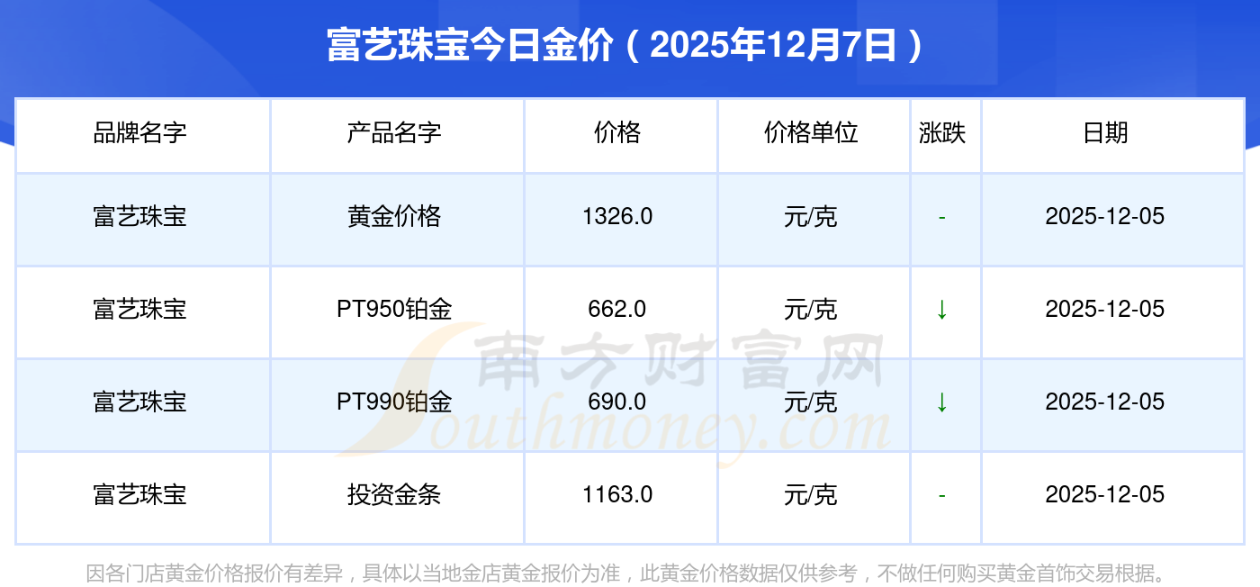 2025年12月7日周大福、周大福、周大福、周大福、周大福、周大福、周大福、老凤祥、老凤祥、老凤祥、周六福等各大金店品牌PT990铂金最新价格如下:周大福黄金价格1328.0元/克,周大福铂金价格662.0元/克,周大福饰品金价(内地)1328.0元/克,周大福黄金饰品(香港)46550.0,周大福铂金价格(香港)18970.0,周大福金条价格(香港)41990.0,周大福金条金价(内地)1165.0元/克,老凤祥黄金价格1325.0元/克,老凤祥铂金价格600.0元/克,老凤祥足金价格1325.0元/克,周六福黄金价格1289.0元/克。
